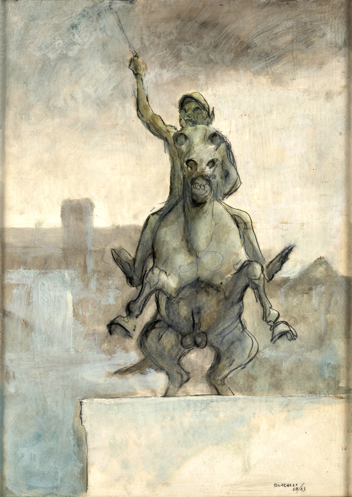 Anthony Joseph Buzzelli UOMO A CAVALLO Matita e olio su cartone, cm 70x50, firma e data in basso a destra "Buzzelli VII/65".