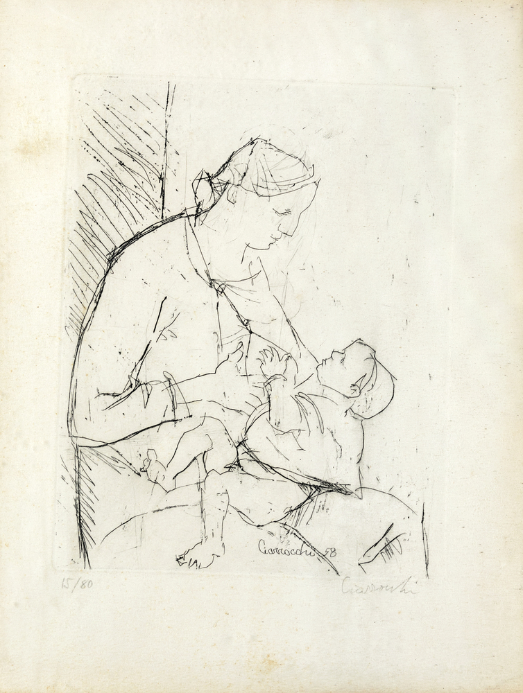 Arnoldo Ciarrocchi MADRE CON BAMBINO Incisione, cm 30x39. Firma e data su lastra "Ciarrocchi '58". Numerazione e firma su foglio "15/80 Ciarrocchi".