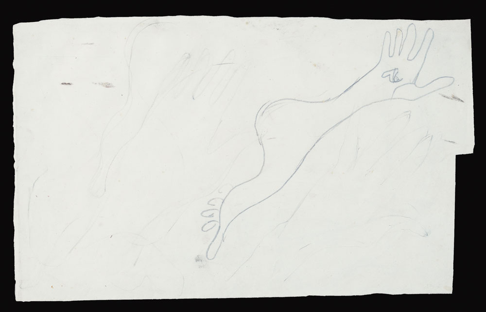 OSVALDO LICINI Monte Vidon Corrado (Ap) 22/03/1894 - Monte Vidon Corrado (Ap) 11/09/1958 - Mano e piede, 1950/52, matita su carta cm. 20,2x33,2; presenta un altro dipinto a matita al retro, opera non firmata, foto del dipinto frontale con dichiarazione di provenienza della Collezione Celi Hellstrom Caterina, dipinto frontale pubblicato sul catalogo della mostra "Osvaldo Licini, totemico errante, disegni 1924-1956" a cura di Roberto Bertorelli, tenutasi presso la Galleria Il Sipario (PR) dal 19 maggio al 30 giugno 2007.