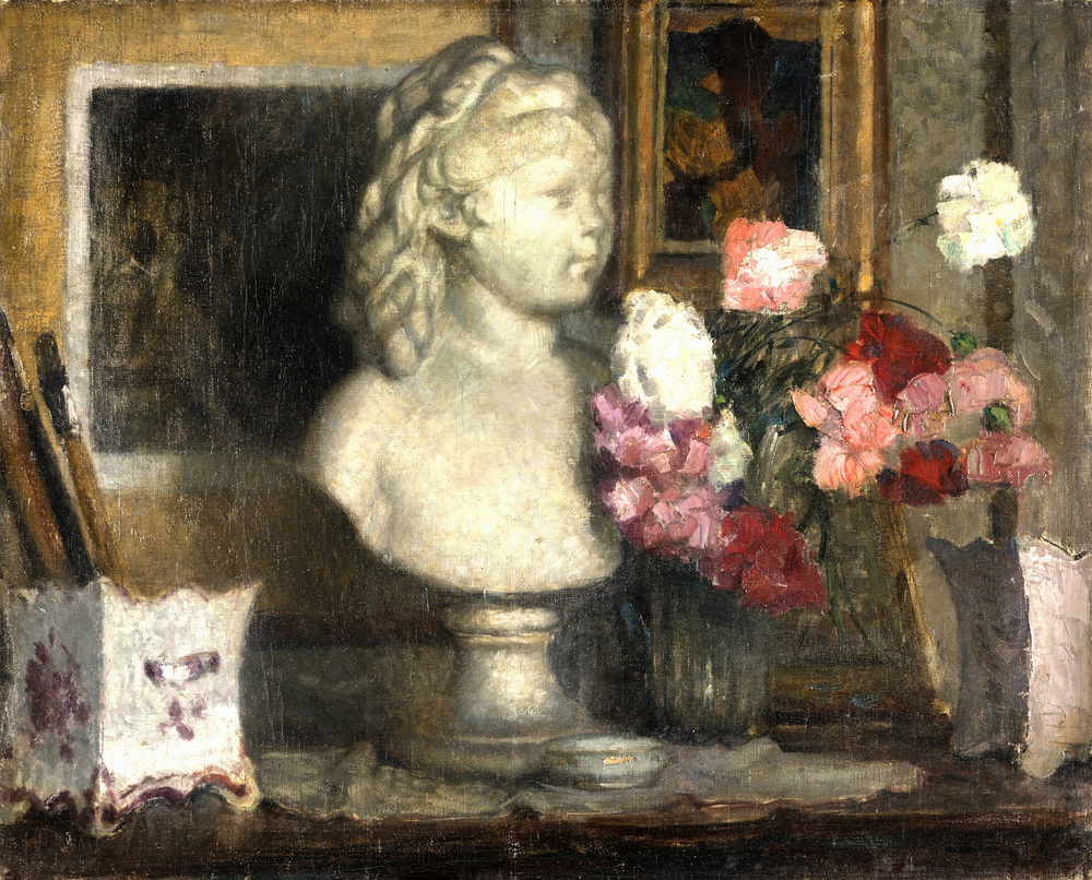 NATURA MORTA CON BUSTO DI DONNA E FIORI Olio su tela, cm 65x81