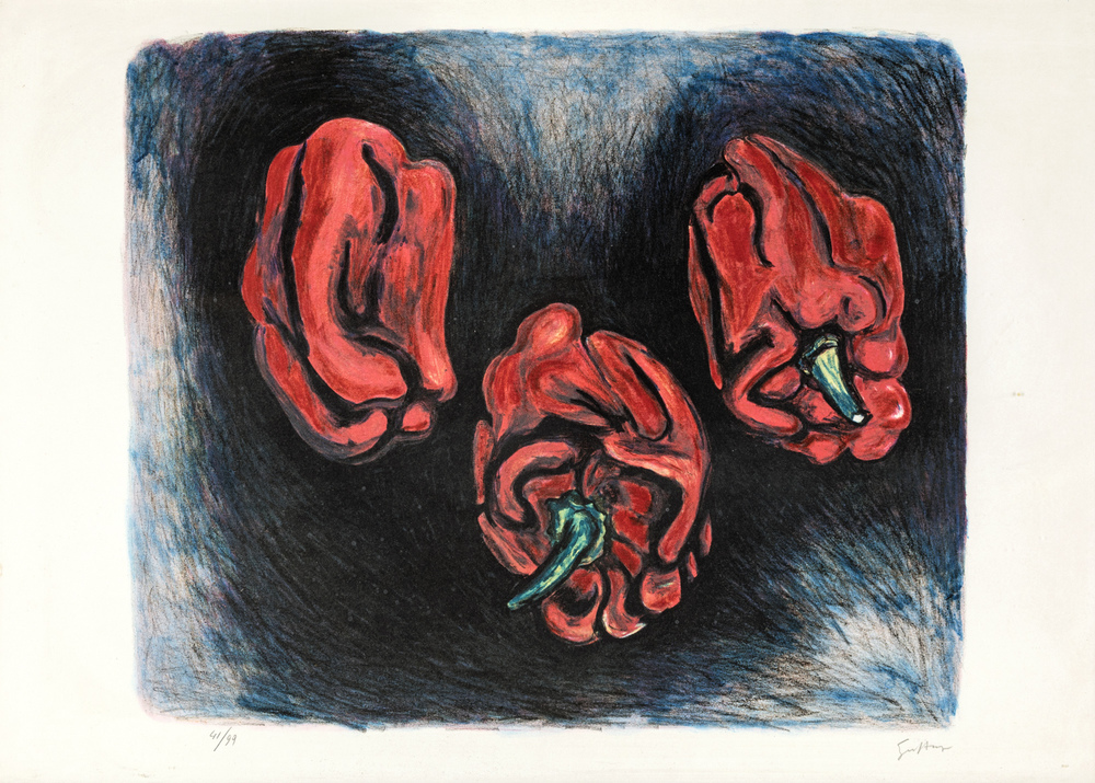 Renato Guttuso LOTTO DI DUE LITOGRAFIE DI GUTTUSO Cactus, 80x62 cm. Firma e numerazione sul fronte "Guttuso 52/130". Timbri sul fronte. Peperoni, 50x70 cm. Firma e numerazione sul fronte "Guttuso, 41/99".