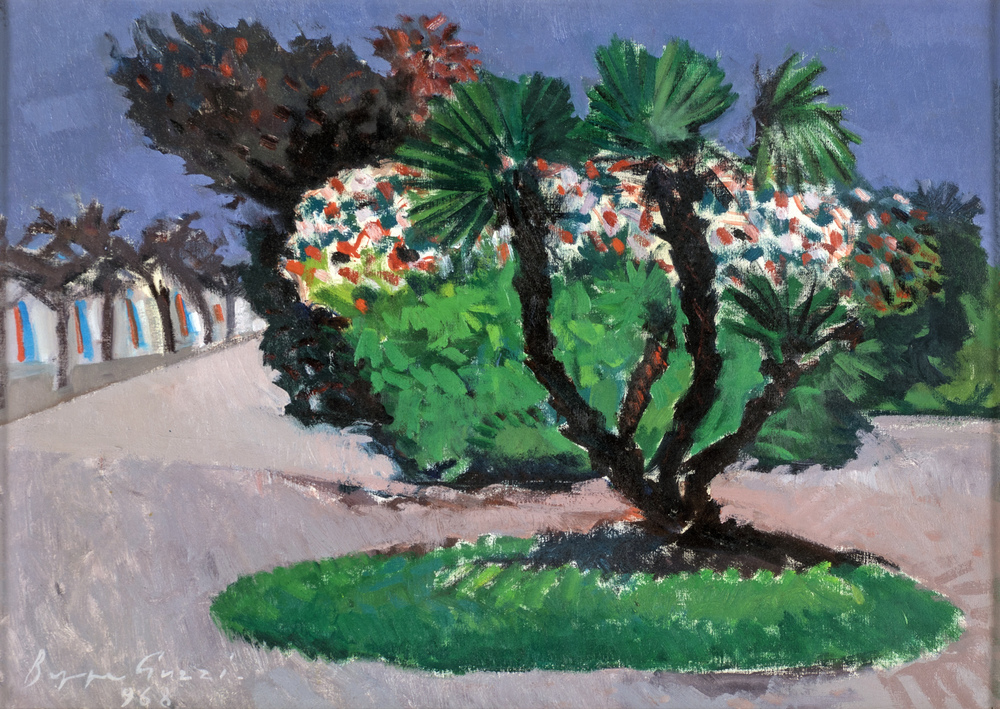 Beppe Guzzi AIUOLA Olio su tela, cm 50x70. Firmato e datato in basso a sinistra "Beppe Guzzi 968". Etichetta della galleria La Vetrata (Roma) sul retro.