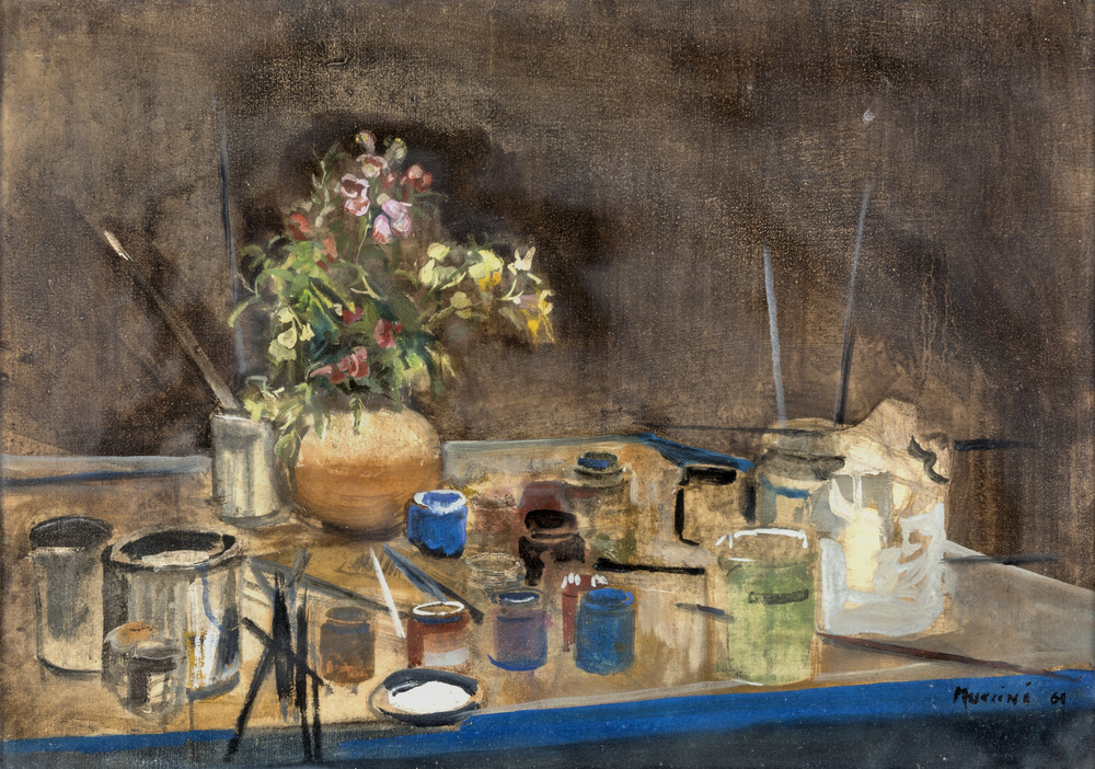 Marcello Muccini NATURA MORTA CON VASO DI FIORI E COLORI Olio su tela, cm 50x70. Firmato in basso a destra "Muccini '64". Sul retro timbro della galleria Fidia (Roma), timbro della galleria La Bussola (Cosenza).