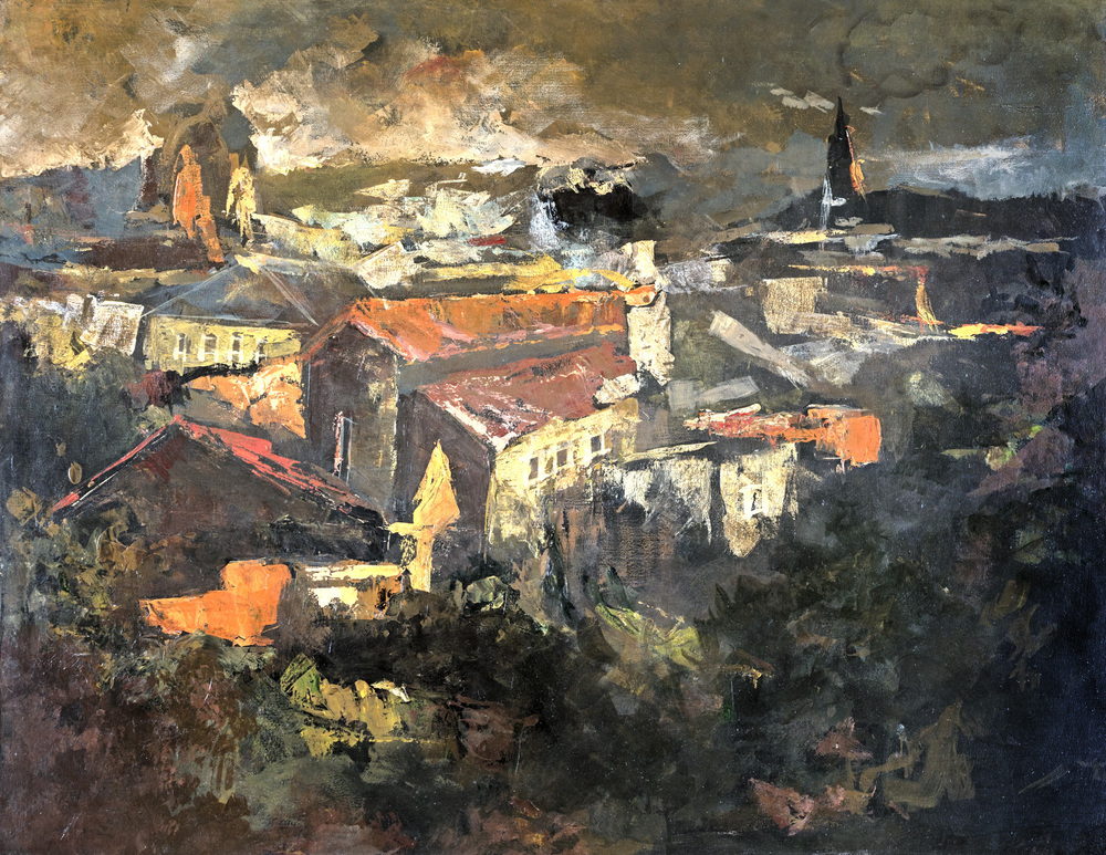 Sergio Scatizzi BOZZETTO TOSCANA Olio su tela, cm 70x90. Sul retro firma, titolo e data "Scatizzi, Bozzetto Toscana, Libreria Ariel 1949".