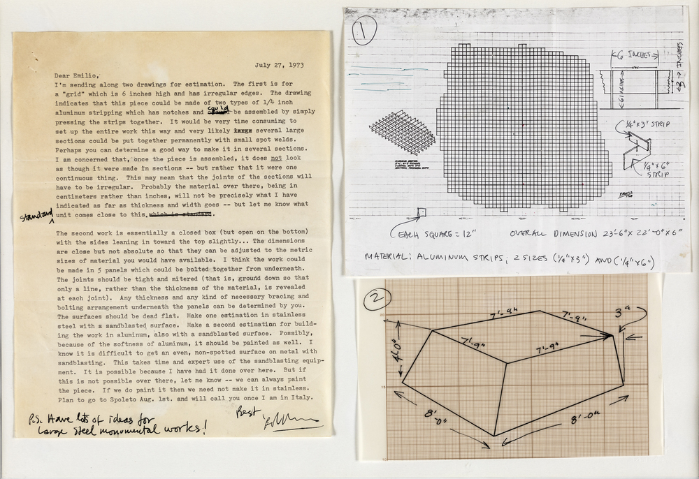 Robert Morris PROGETTI DI REALIZZAZIONE OPERE Due disegni ed una lettera tra Robert Morris e il gallerista Emilio Rebora, cm 33x48.