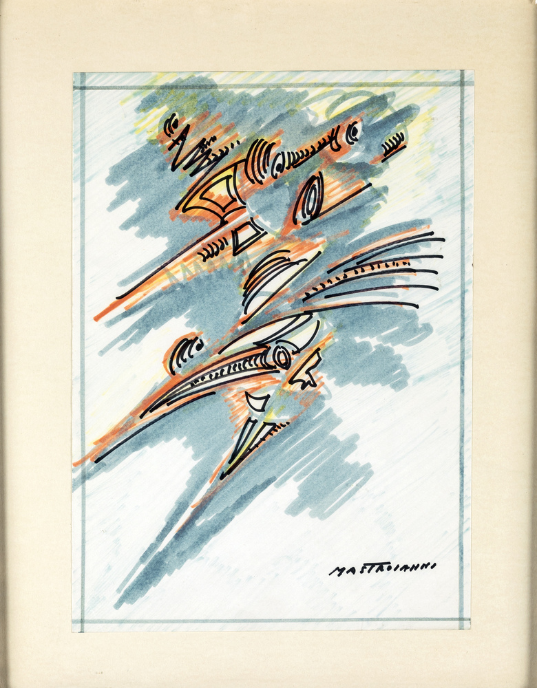 Umberto Mastroianni BOZZETTO PER L'UCCELLO DI FUOCO Tecnica mista su carta, cm 35x25 circa. Firma "Mastroianni" sul fronte. Opera eseguita nel 1984. Al retro etichetta della Rubinarte (Roma).