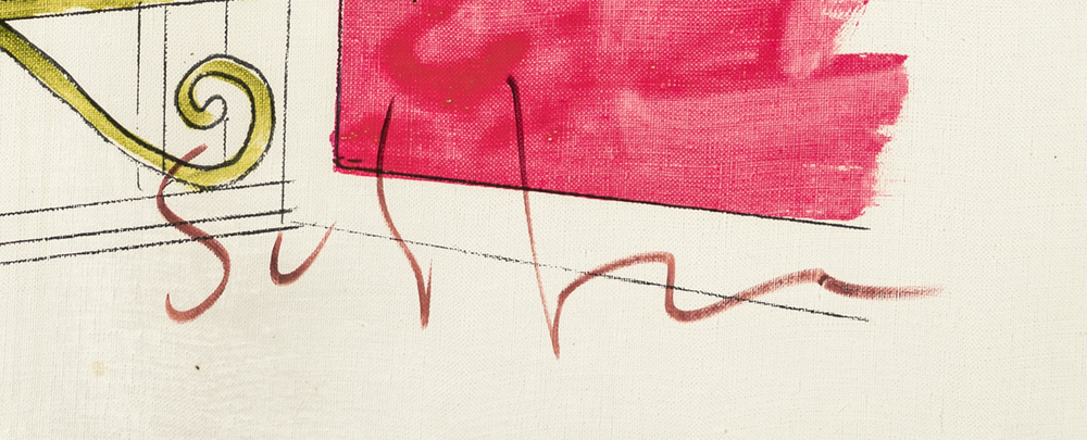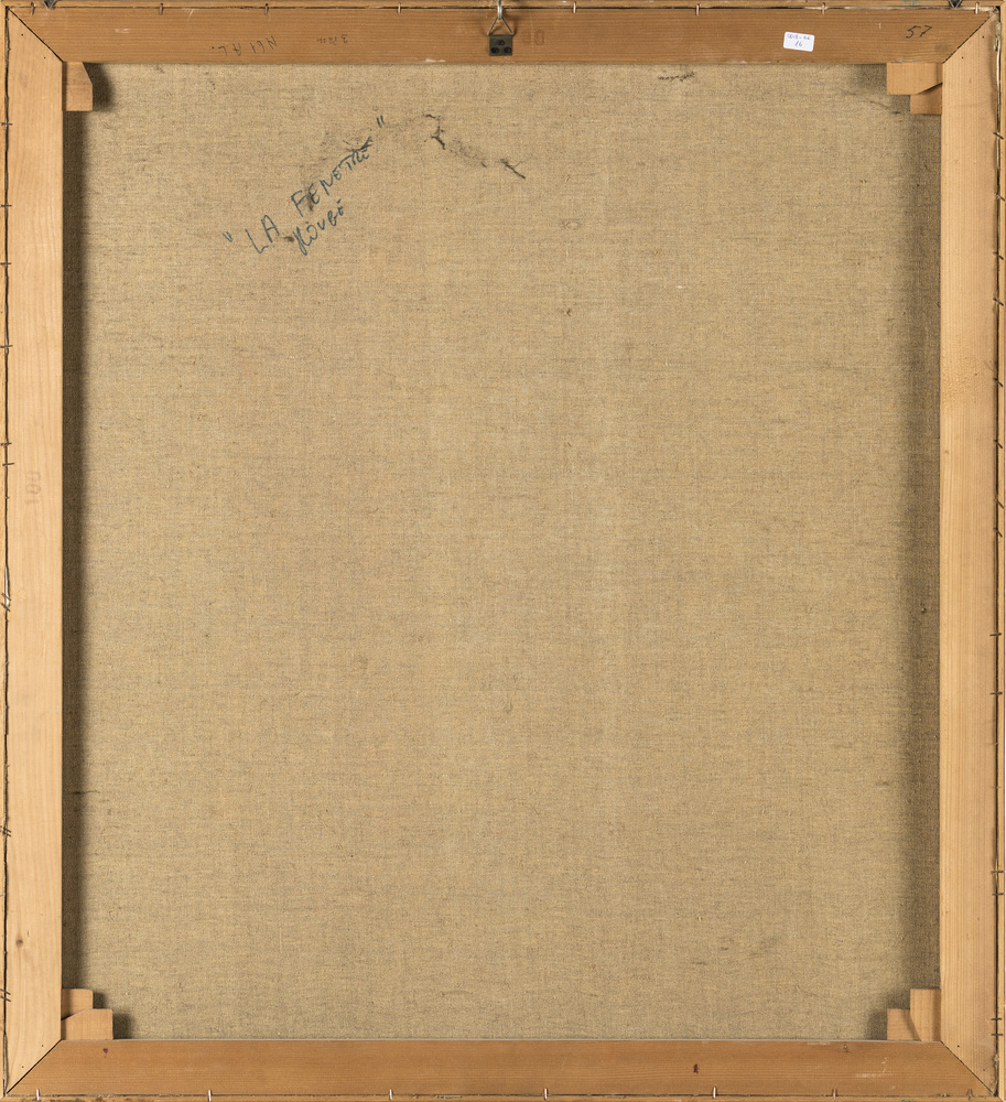 Mario Schifano LA FENETRE ROUGE Smalto su tela, cm 100x90. FIrma sul fronte "Schifano". Al retro titolo. L'opera presenta nella parte frontale in alto un taglio nella tela di circa 3 cm. Opera in attesa di archiviazione.