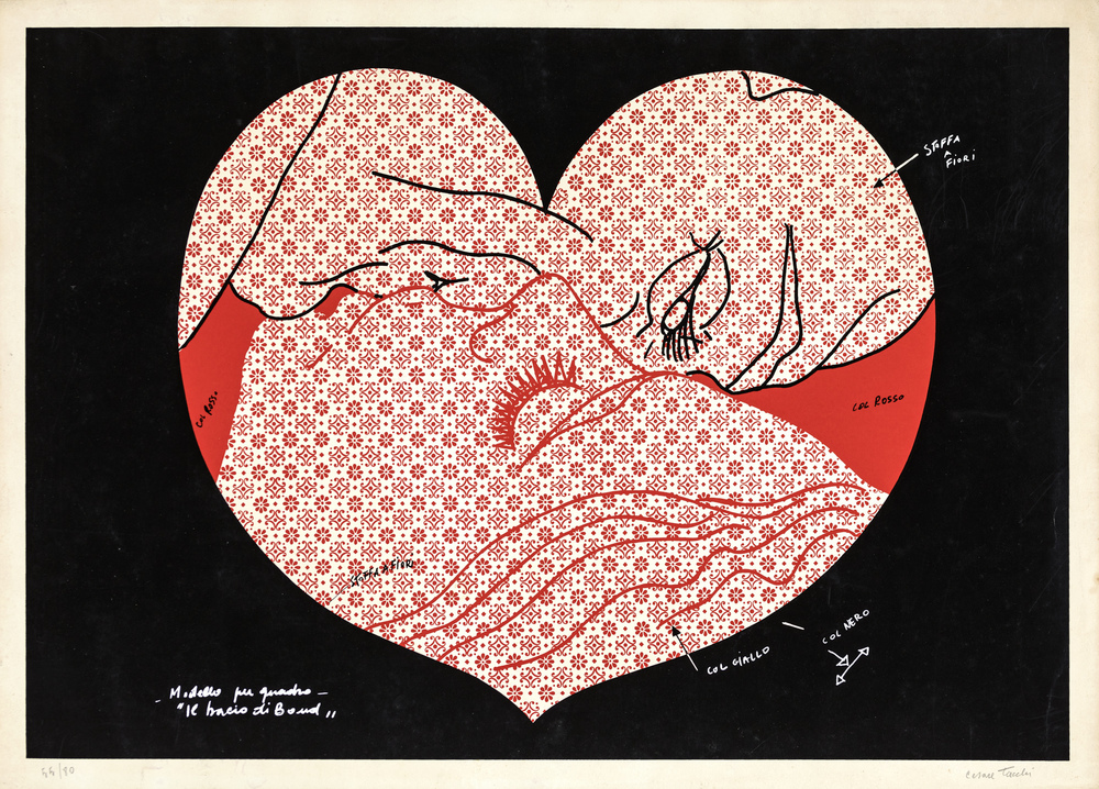 Cesare Tacchi MODELLO PER QUADRO IL BACIO DI BOND Litografia, cm 50x70. Firma e tiratura sul fronte "Cesare Tacchi, 55/80.
