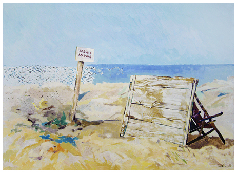 WALTER CECCHI Firenze 1928 – Livorno 2005 Spiaggia proibita 1969 Olio su tela 70 x 100. Data e firma in b. a d.; sul verso firma, data, località e titolo + timbri galleria La Saletta, Livorno. B.A.: 100