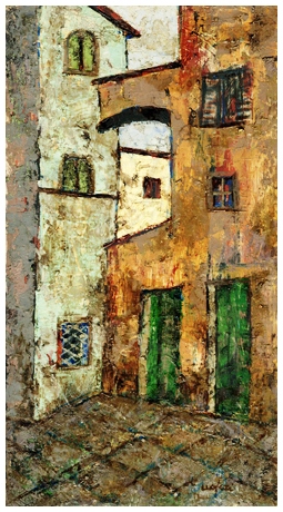 MARIO NOFERI San Giuliano Terme 1942 Testimonianze: la città che scompare / i vicoli 1977 Olio su tavola 30 x 16. Firma in b. a d.; sul verso titolo, firme, data e indirizzo studio dell’artista. B.A.: 50
