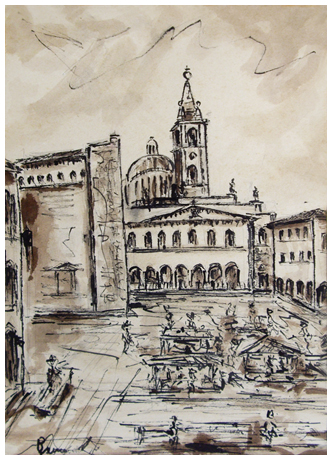RENZO BUSSOTTI Firenze 1925 – Padova 2017 Senza titolo (Piazza SS. Annunziata, Firenze) Tec. mista su cartoncino 35 x 25. Firma in b. a s. B.A.: 50