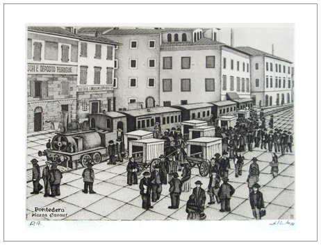 GIORGIO DAL CANTO Pontedera 1934 – Pontedera 2016 Pontedera, Piazza Cavour 1977 Acquaforte e acquatinta es.P.A. Firma e data in b. a d., sulla lastra: titolo in b. a s., sigla dell’artista in b. a d. (50 x 70 ca. foglio – 29 x 40 inc.) B.A.: 70