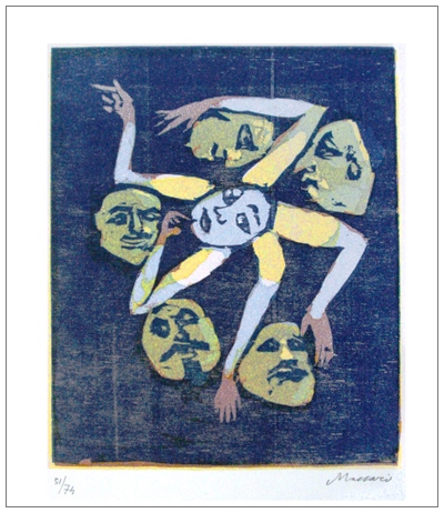 MINO MACCARI Siena 1898 – Roma 1989 Senza titolo 1974 Linoleumgrafia a colori es.51/74. Firma in b. a d. (51 x 35 foglio – 26,1 x 21,8 lin.) L’opera fa parte della cartella “Omissis” composta di 16 incisioni a colori su carta Magnani di Pescia + 1 incisione sulla prima di copertina + 1 incisione sulla seconda di copertina, eseguita da Maccari per i suoi amici nel 1974. Tiratura: 74 es. num. arabi + alcuni es.prova di stampa e prova d’artista. Pubbl.: “Mino Maccari Catalogo ragionato delle incisioni” a cura di Francesco Meloni, Electa Editrice, Milano, 1979, volume primo, p.196, n.811. B.A.: 50