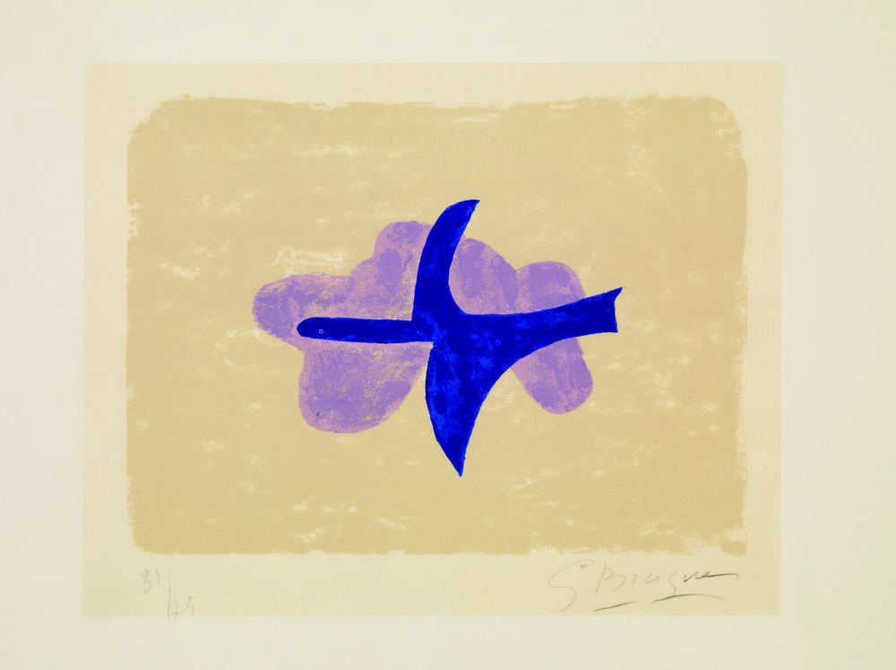 Braque Georges DANS LE CIEL (OISEAUX XV). 1958 Litografia a 4 colori. mm 288x363. Foglio: mm 380x555. Vallier, 124. Firmata e numera a matita “ 31/75”. Tiratura a 75 esemplari firmati e numerati edita a Parigi da Maeght e stampata da Mourlot nel 1958. Ottima impressione stampata su Vélin d’Arches. Timbro a secco della Libreria Prandi di Reggio Emilia. Grandi margini editoriali.