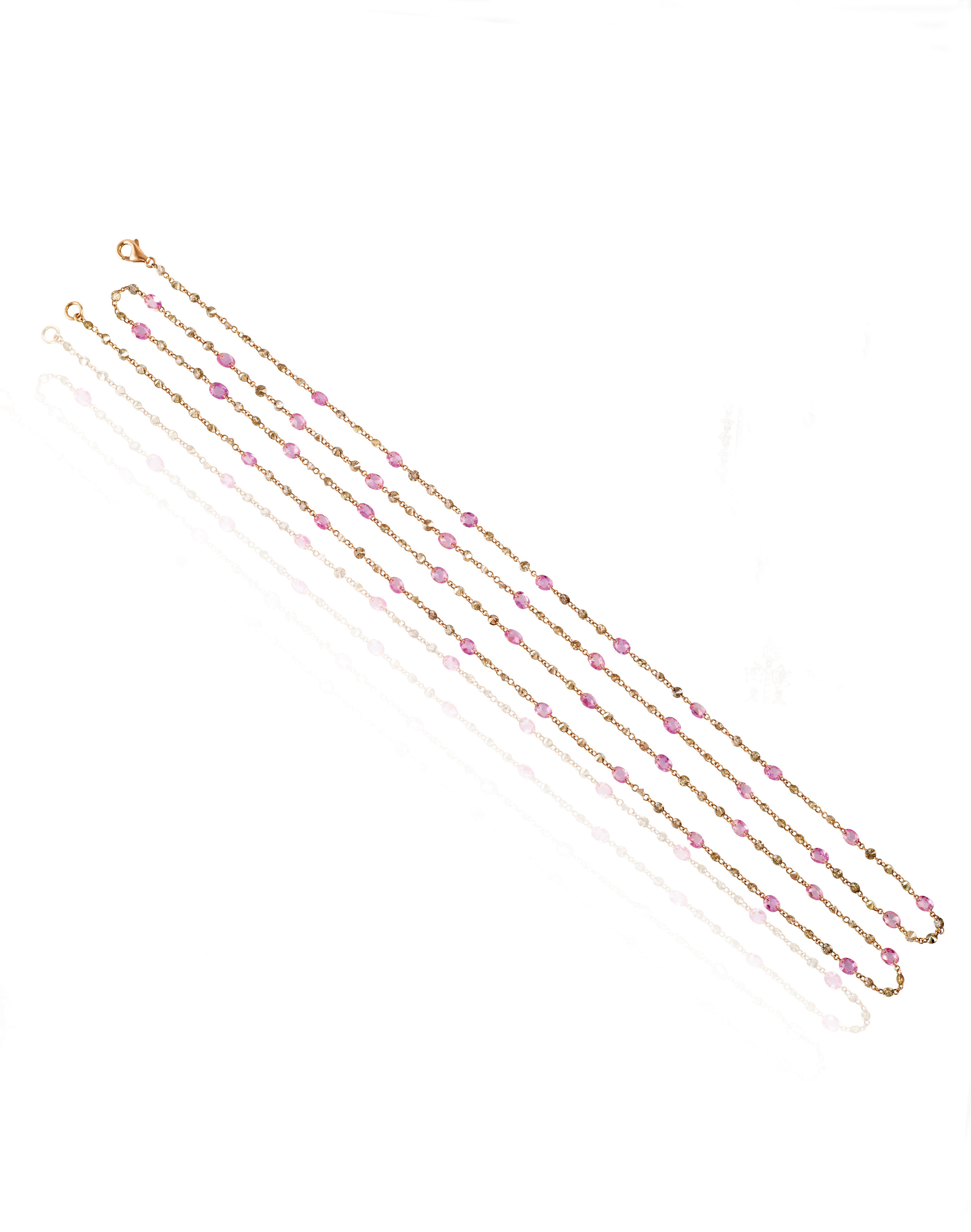 LUNGA COLLANA IN ORO ROSA, DIAMANTI BROWN E ZAFFIRI ad una linea di diamanti brown taglio brillante rotondo per ct 8.00 circa e zaffiri rosa taglio ovale per ct 6.90 circa forati a laser ed uniti tra loro da maglie in oro, punzone 750, lungh. cm 90 LONG CHAIN IN ROSE GOLD, BROWN DIAMONDS AND PINK SAPPHIRES