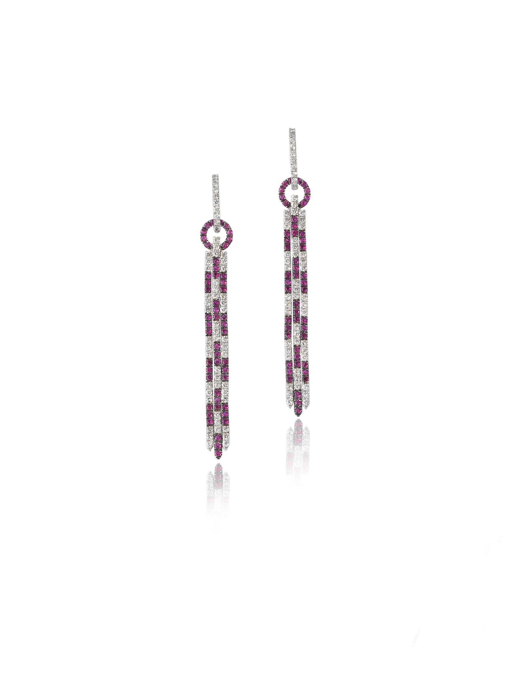 PAIO DI ORECCHINI PENDENTI IN ORO BIANCO, DIAMANTI E RUBINI monachella in oro e brillanti con pendente a tre linee di rubini e diamanti taglio brillante rotondo entro montatura flessibile, punzone 750, lungh. cm 7 PAIR OF PENDANT EARRINGS IN WHITE GOLD, RUBIES AND DIAMONDS
