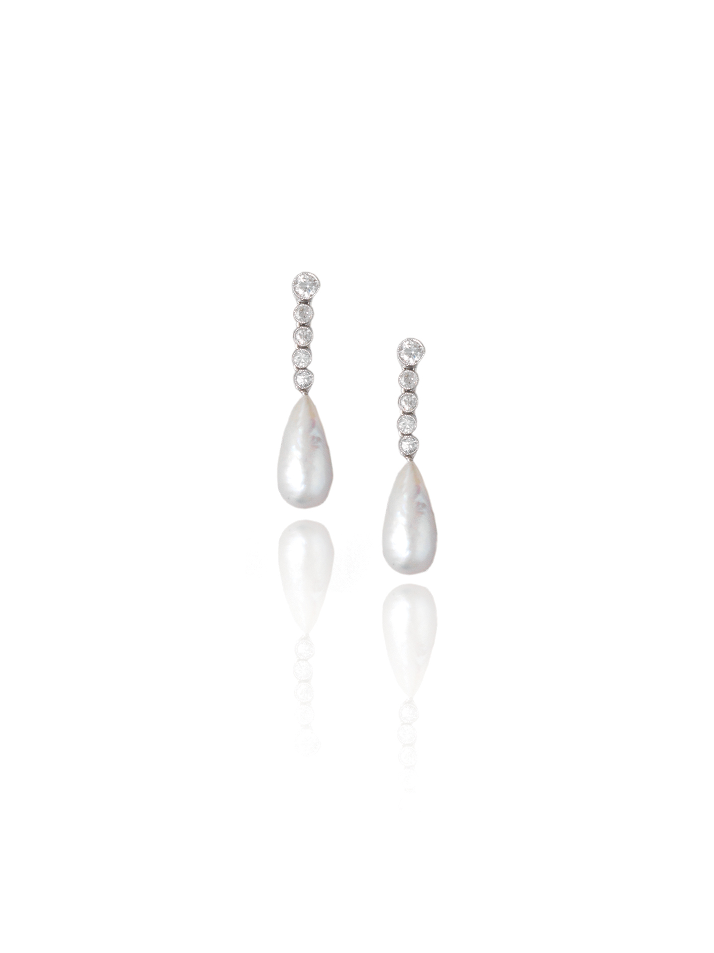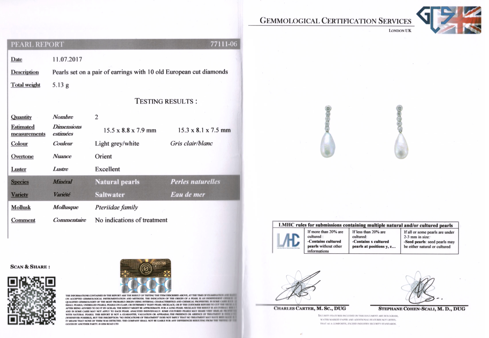 PAIO DI ORECCHINI PENDENTI IN PLATINO, PERLE NATURALI E DIAMANTI, INIZI SEC. XX ad una linea di diamanti taglio brillante rotondo entro castoni snodati e due perle naturali a goccia di mm 15,5x8,8x7,9 e mm 15,3x8,1x7,5, lungh. cm 3,2 corredato di certificato GCS n. 77111-06 datato 07/2017 che attesta l’origine naturale d’acqua salata delle perle PAIR OF PENDANT EARRINGS IN NATURAL PEARLS, DIAMONDS AND PLATINUM, EARLY 19TH CENTURY
