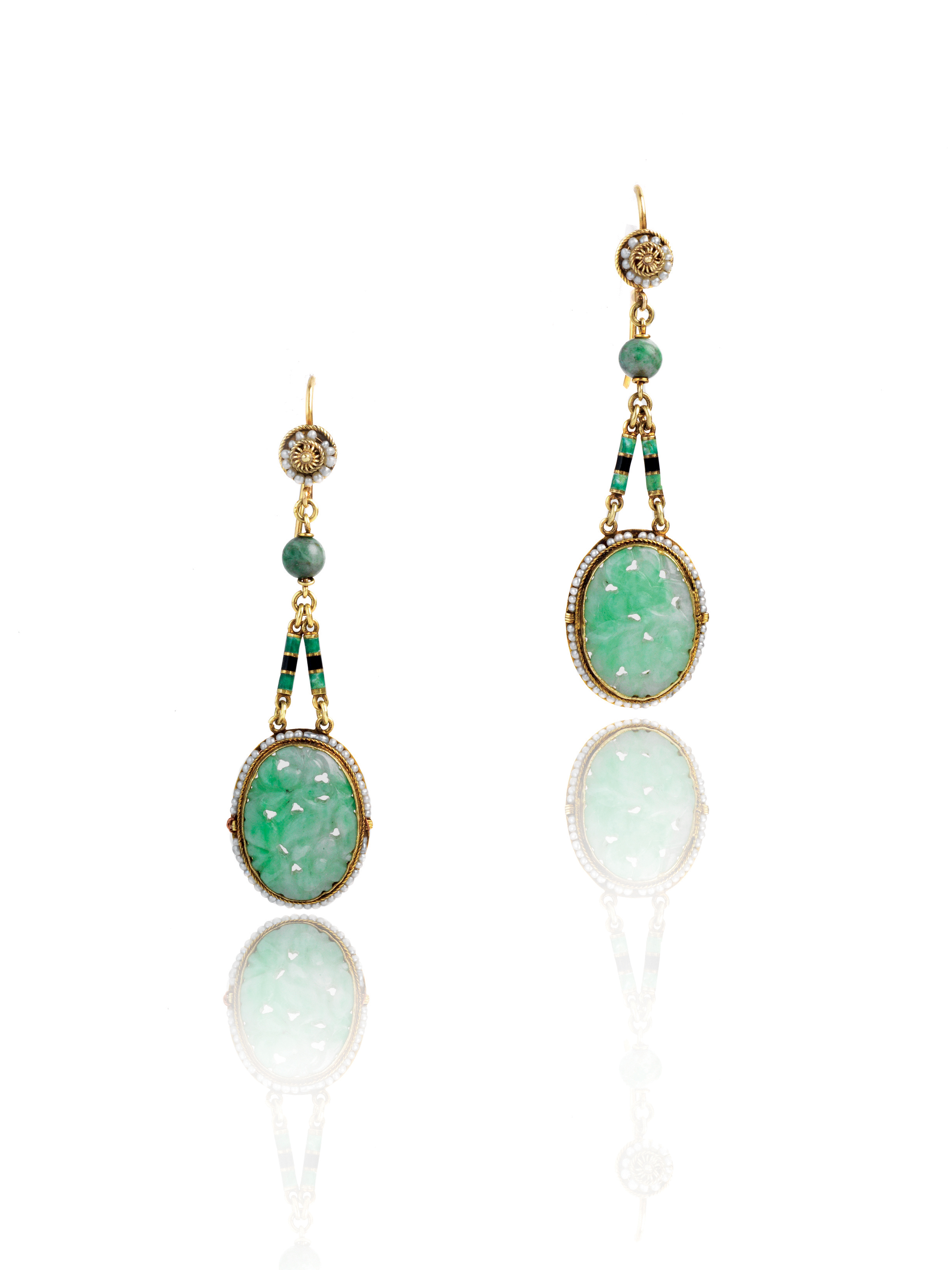 PAIO DI ORECCHINI PENDENTI IN ORO GIALLO, GIADEITE, SMALTI E MICROPERLE, 1900...