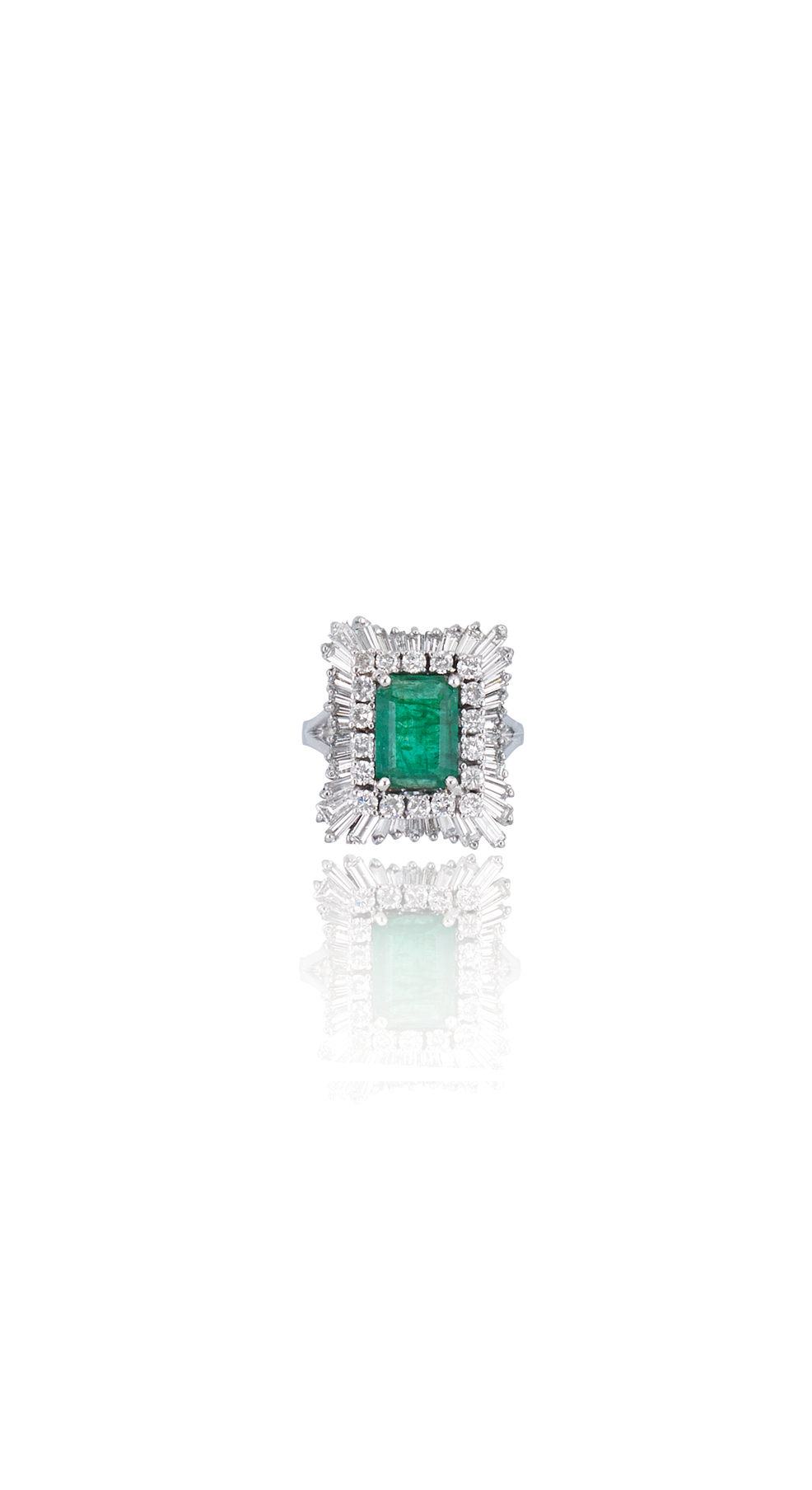 ANELLO IN PLATINO, DIAMANTI E SMERALDO montatura rettangolare ondulata a due file di diamanti rispettivamente taglio baguette e brillante rotondo per ct 3.80 circa, al centro uno smeraldo taglio ottagonale di ct 2.00 circa, punzone PT950, mis. 11 EMERALD, DIAMONDS AND PLATINUM RING
