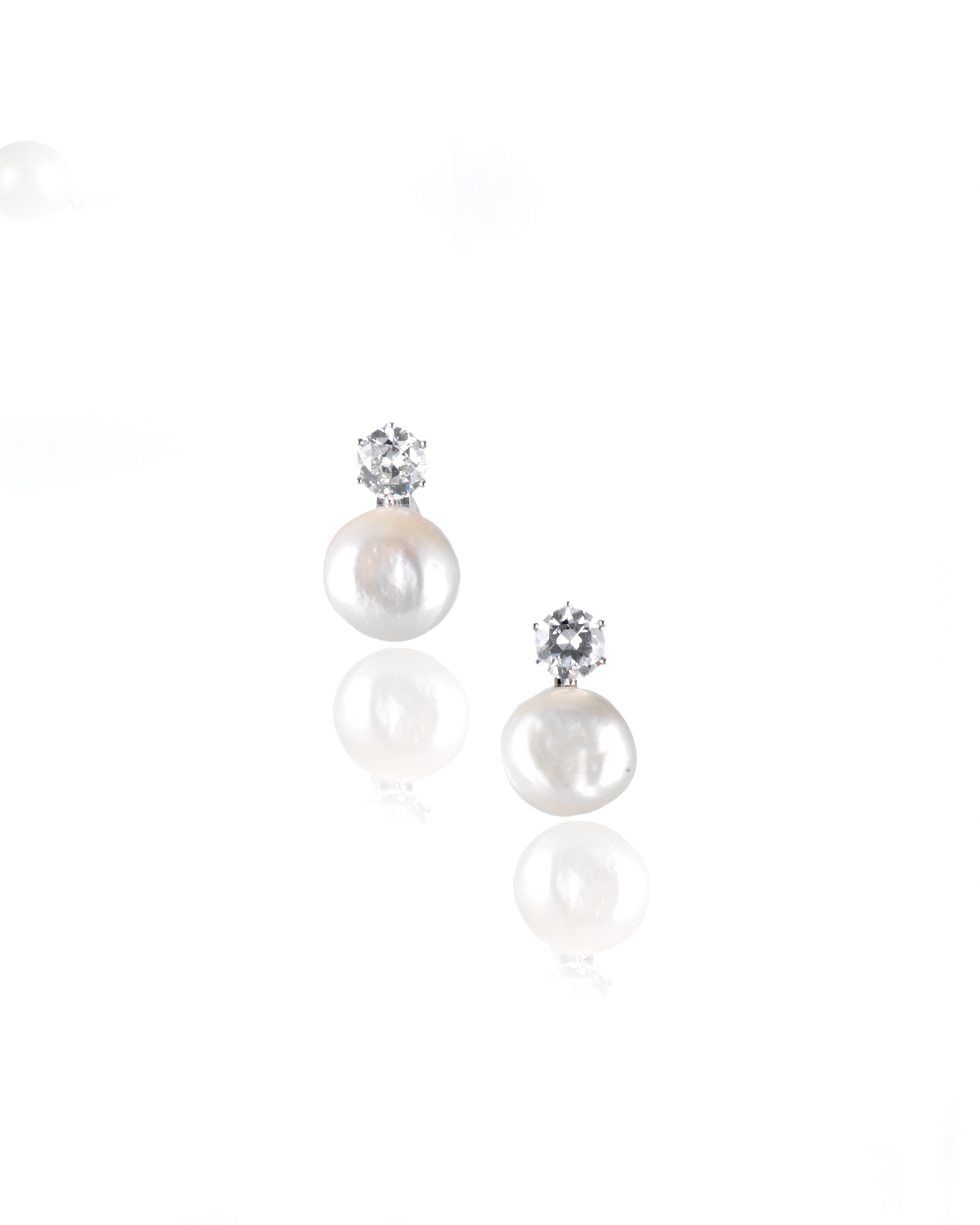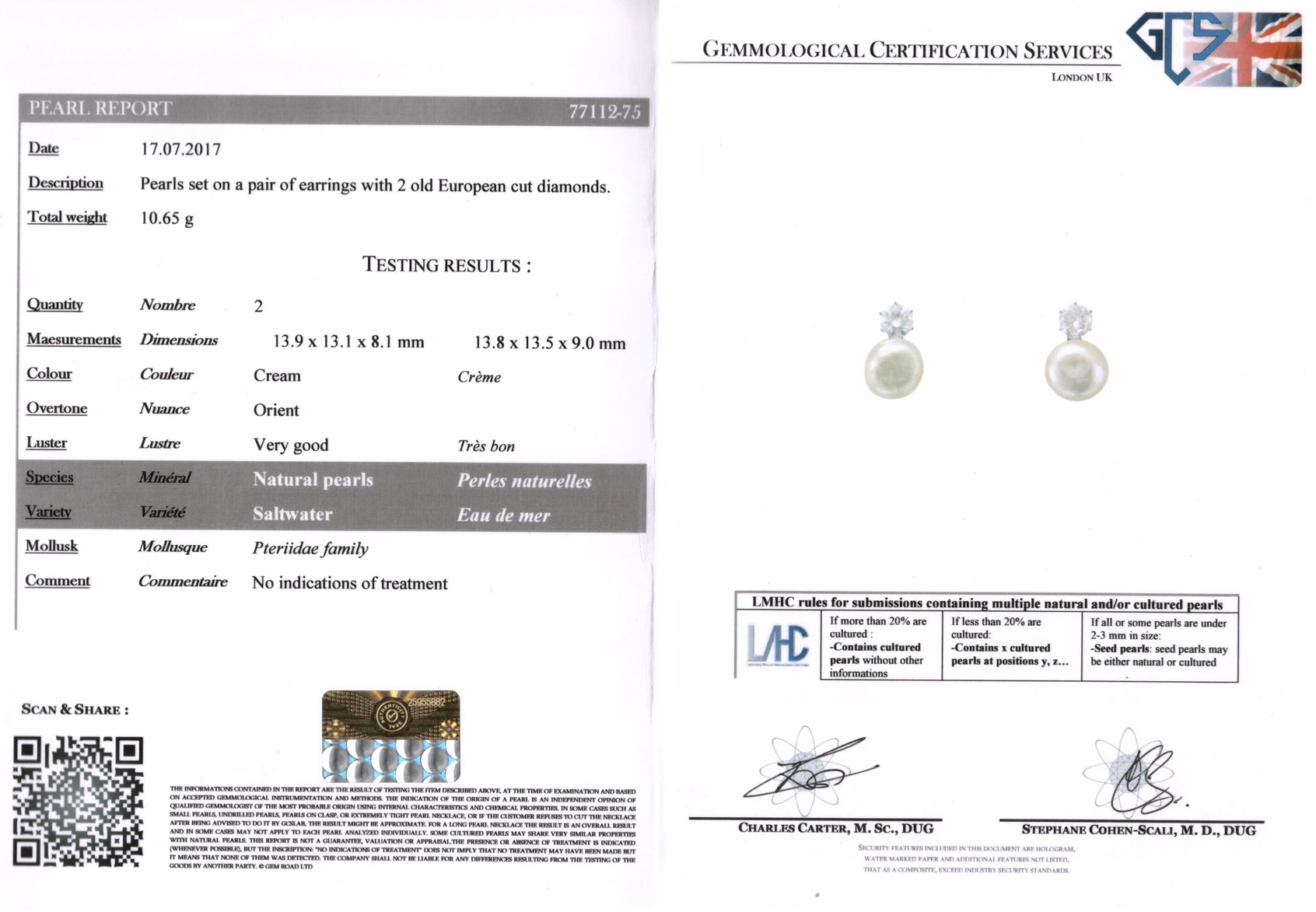 PAIO DI ORECCHINI IN ORO BIANCO, PERLE NATURALI E DIAMANTI due perle naturali a bottone di mm 13,9x13,1x8,1 e mm 13,8x13,5x9,0 entro montatura decorata da due diamanti taglio vecchio per ct 2.50 circa, lungh. cm 2 corredato di certificato GCS n. 77112-75 datato 07/2017 che attesta l’origine naturale d’acqua salata delle perle NATURAL PEARLS, DIAMONDS AND WHITE GOLD EARRINGS