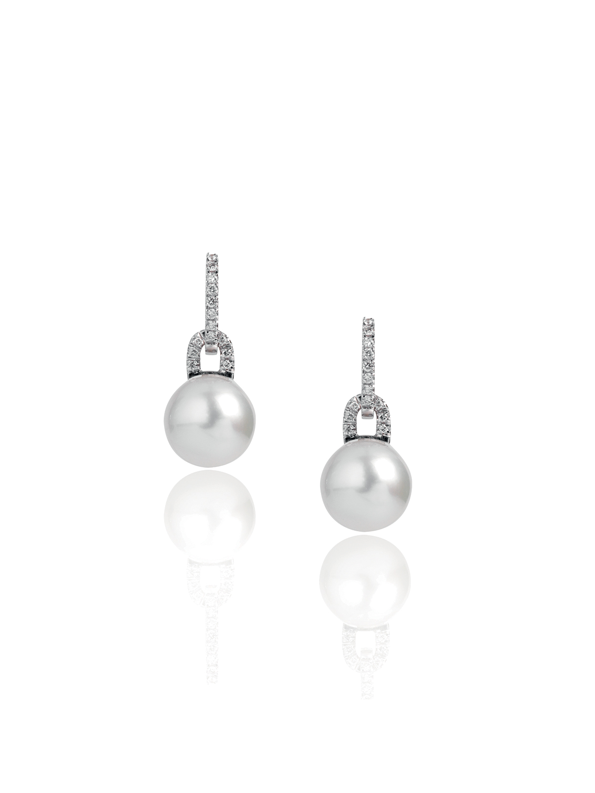 PAIO DI ORECCHINI PENDENTI IN ORO BIANCO, PERLE E DIAMANTI monachella...