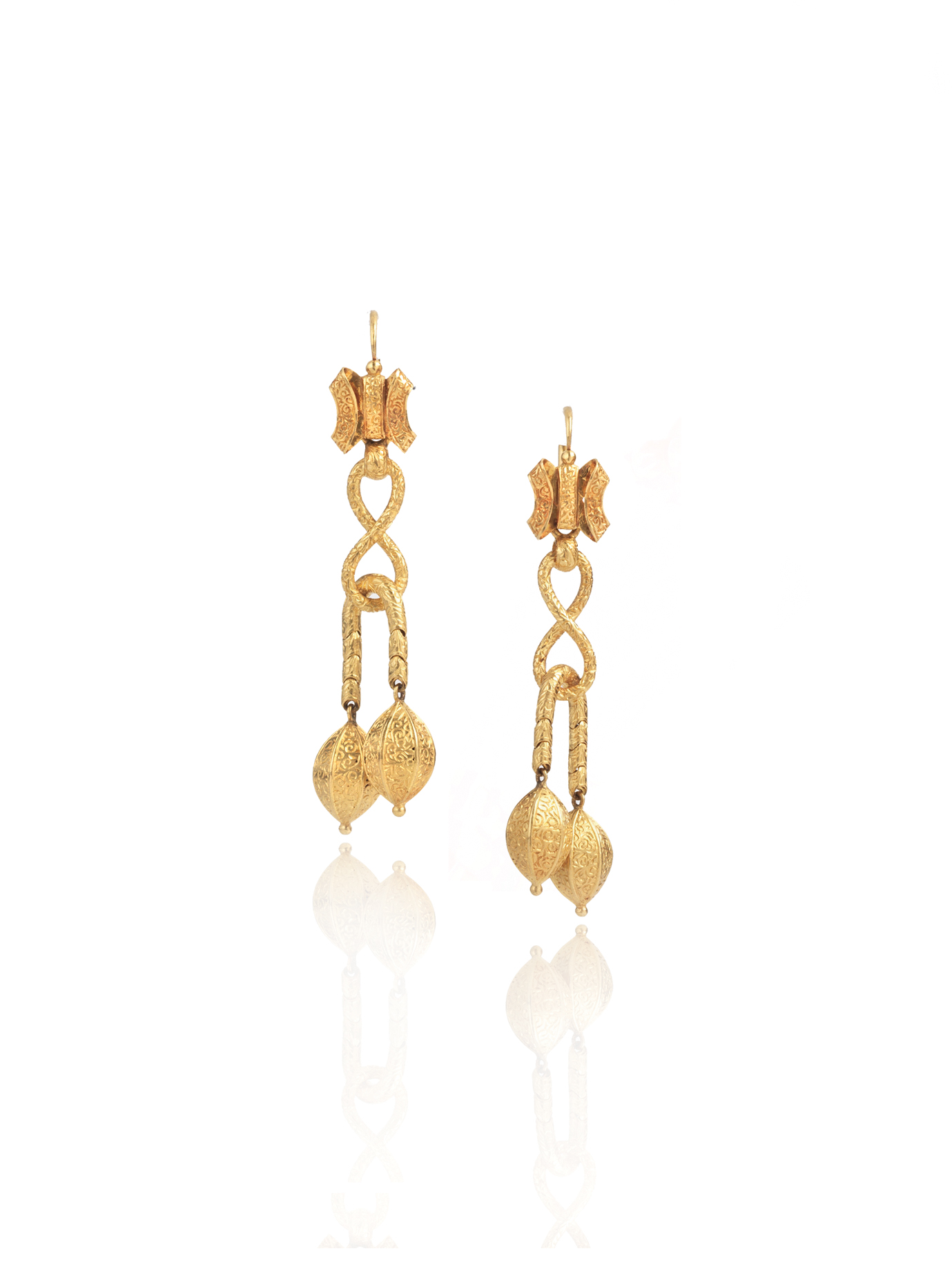 PAIO DI ORECCHINI PENDENTI IN ORO GIALLO, FINE SEC. XX motivi a fiocco, elementi ad otto e parte finale snodata a canna vuota, pendenti ovali in oro giallo interamente cesellato, lungh. cm 6,5 PAIR OF PENDANT EARRINGS IN ENGRAVED YELLOW GOLD, LATE 19TH CENTURY