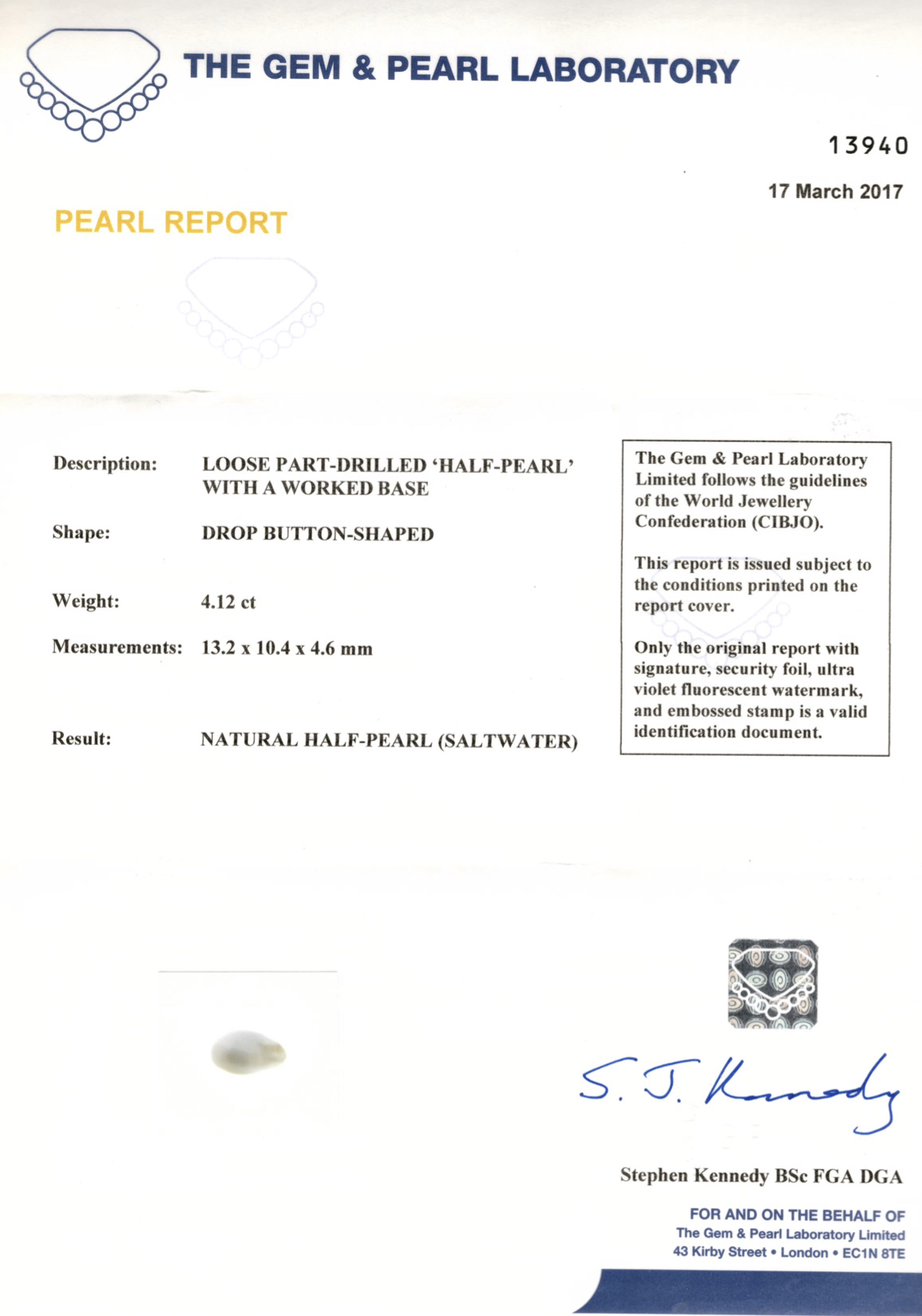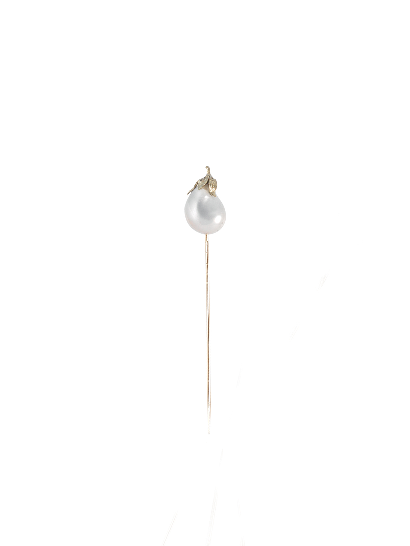 SPILLONE IN ORO GIALLO E PERLA NATURALE una perla naturale a goccia di mm 13,2x10,4x4,6 entro montatura a guisa di melanzana, lungh. cm 7 corredato di certificato TG&PL n. 13940 datato 03/2017 che attesta l’origine naturale d’acqua salata della perla NATURAL PEARL AND YELLOW GOLD PIN