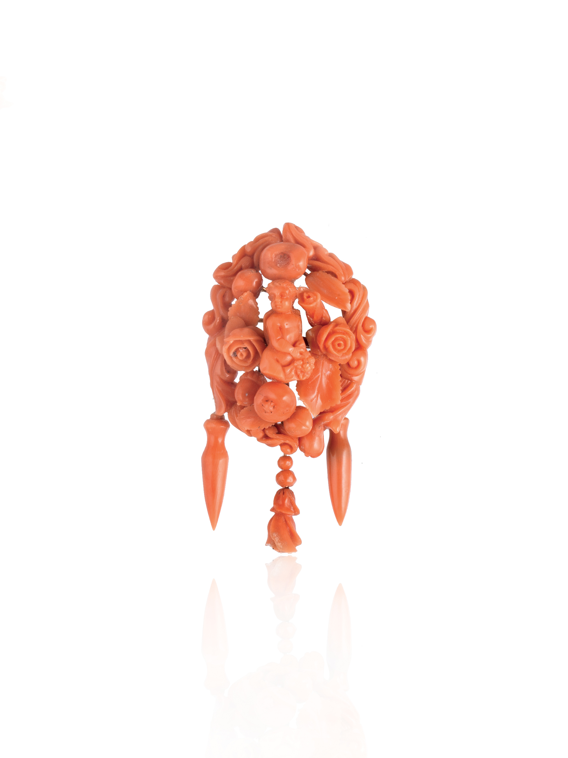 PENDENTE/SPILLA IN ORO GIALLO E CORALLO, FINE SEC. XIX realizzato in corallo intagliato a motivi vegetali e figura antropomorfa su montatura in oro giallo 14 kt corredato di ago e gancio, tre elementi pendenti in corallo, dim. cm 6,5x3,5 CARVED CORAL AND 14K YELLOW GOLD PENDANT/BROOCH, LATE 19TH CENTURY