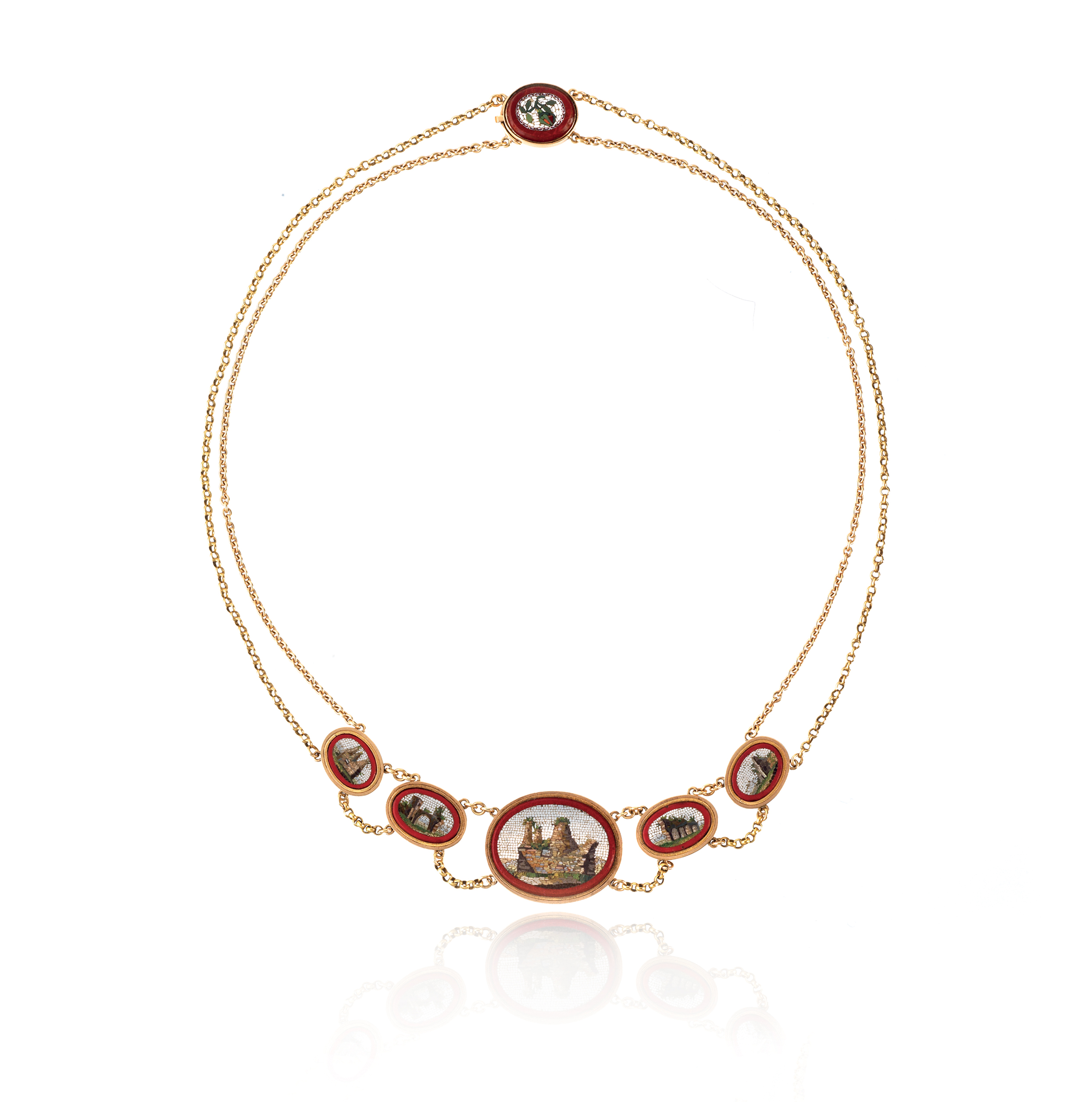 COLLANA IN ORO GIALLO E MICROMOSAICI, FINE SEC. XIX a due file di catena a maglia sottile intercalata da cinque micromosaici ovali raffiguranti rovine architettoniche posti in gradazione entro castoni in oro cesellato, chiusura decorata da un micromosaico a motivo floreale, lungh. cm 42 MICROMOSAICS AND YELLOW GOLD CHAIN NECKLACE, LATE 19TH CENTURY