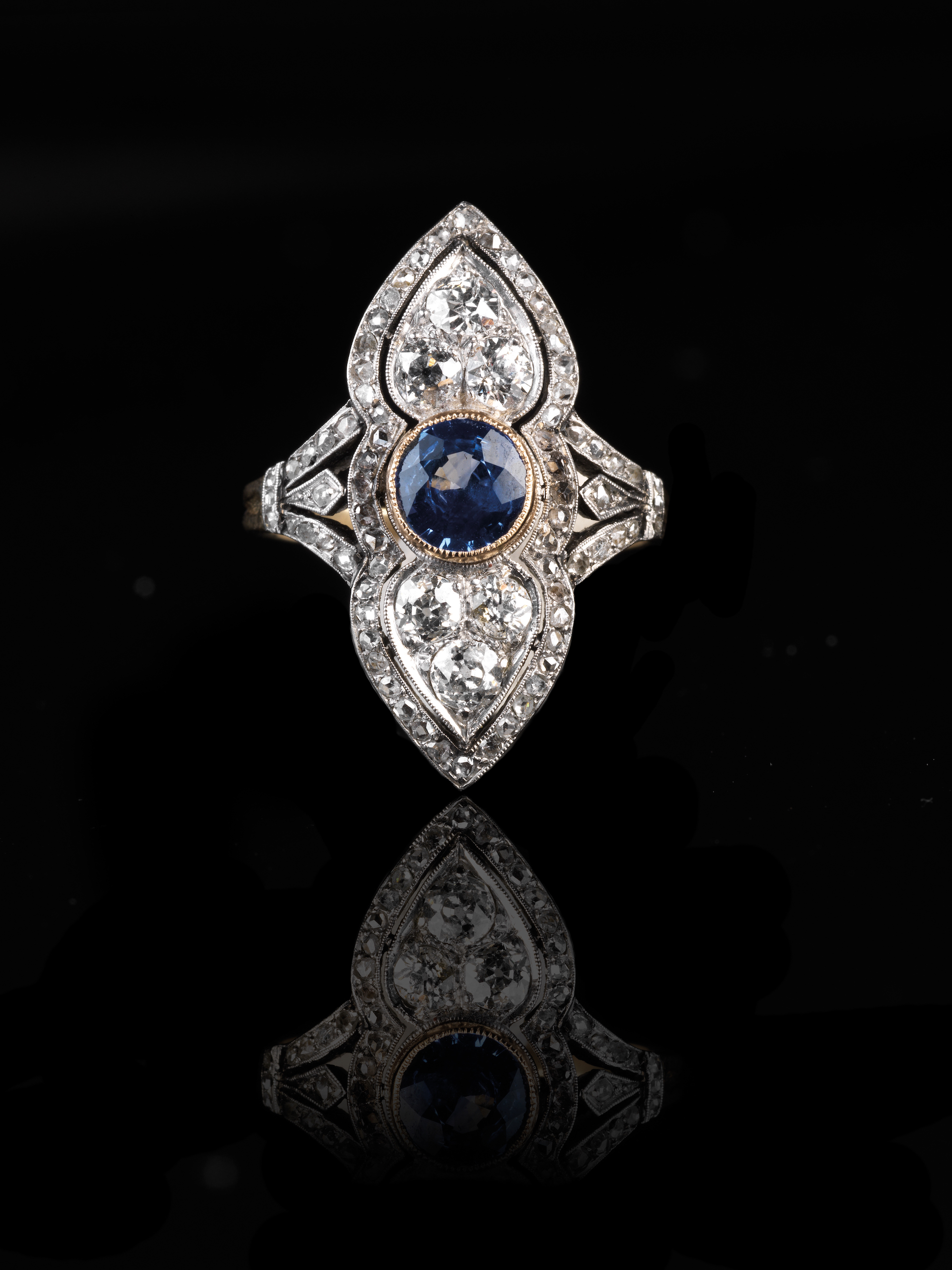 ANELLO IN ORO GIALLO, ARGENTO, DIAMANTI E ZAFFIRO, INIZIO SEC. XX motivo a gocce contrapposte in argento traforato e foderato in oro giallo 14 kt decorato in diamanti taglio vecchio e rosa per ct 1.40 circa, al centro uno zaffiro taglio rotondo di ct 1.20 circa, mis. 17, entro scatola Leopoldo Settepassi DIAMONDS, SAPPHIRE, 14K YELLOW GOLD AND SILVER RING, EARLY 20TH CENTURY accompanied by Leopoldo Settepassi box
