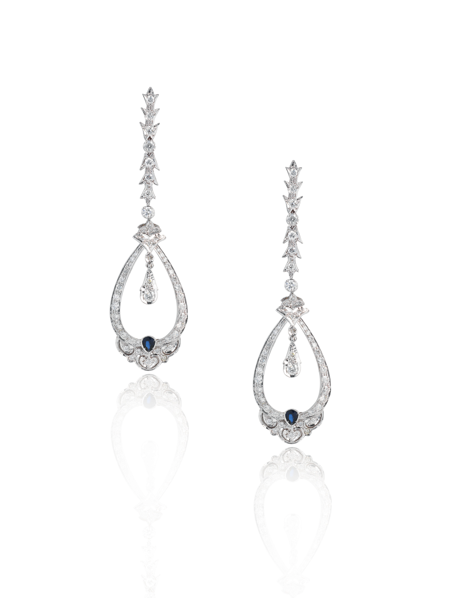PAIO DI ORECCHINI PENDENTI IN ORO BIANCO, DIAMANTI, ZAFFIRI E CRISTALLO DI ROCCA ad una linea di elementi sagomati e castoni in oro bianco 14 kt decorati in brillanti, pendente a goccia centrato da cristallo di rocca matt entro corolla in diamanti e zaffiri, punzone 585, lungh. cm 6,8 PAIR OF PENDANT EARRINGS IN DIAMONDS, SAPPHIRES, ROCK CRYSTAL AND 14K WHITE GOLD
