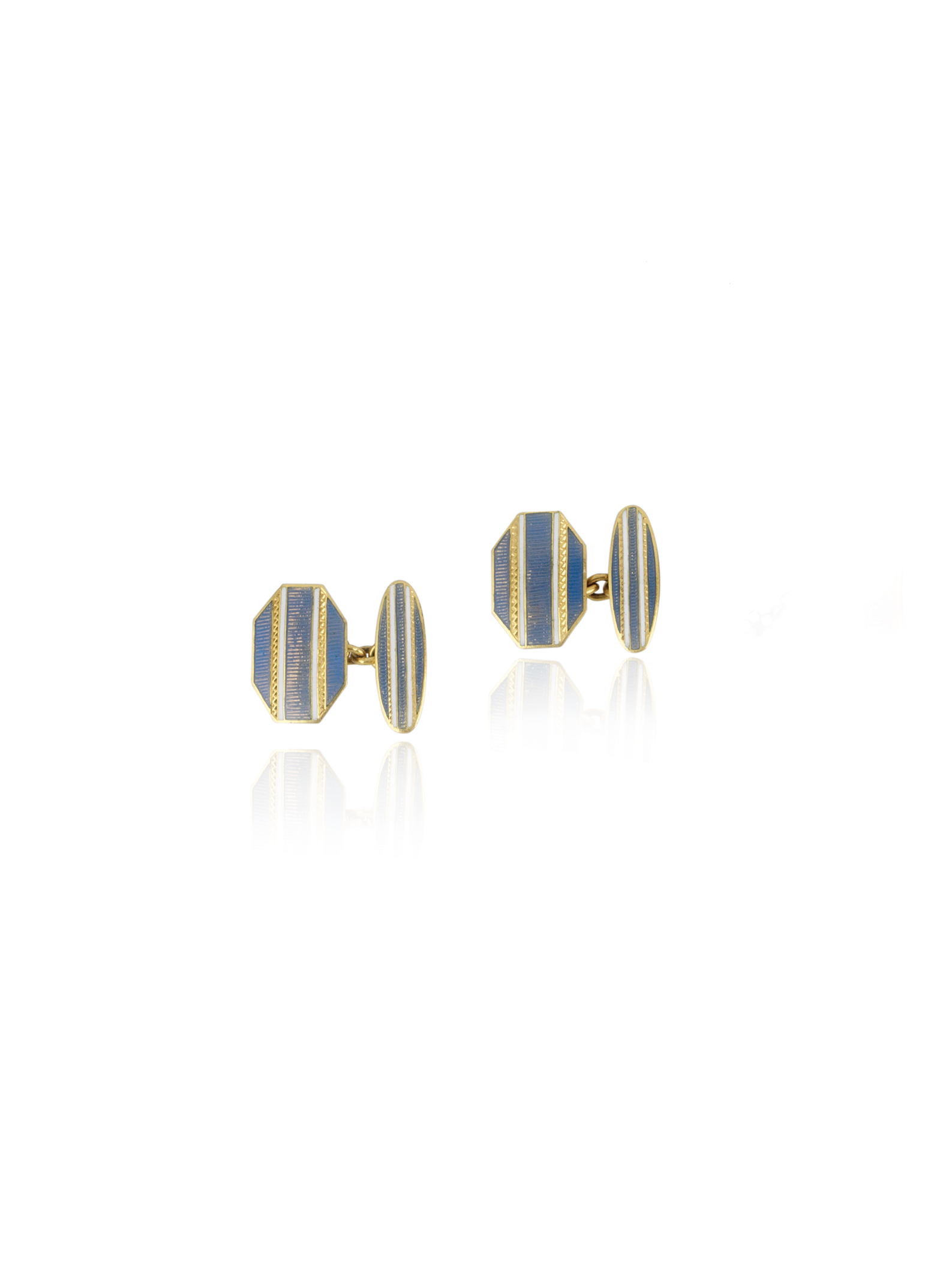 PAIO DI GEMELLI IN ORO GIALLO E SMALTI POLICROMI alle estremità un elemento ottagonale ed uno ovale in oro inciso decorato in smalti azzurro e bianco PAIR OF CUFFLINKS IN YELLOW GOLD AND ENAMEL