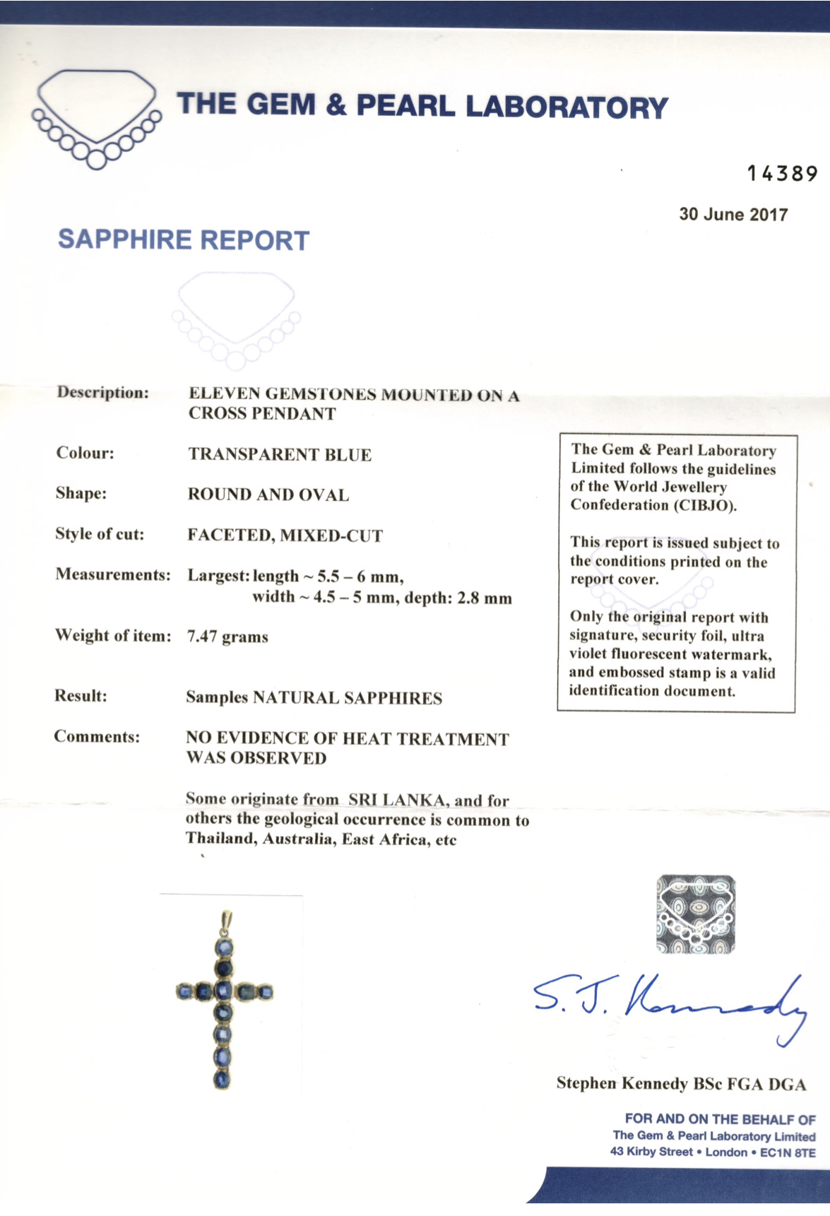 PENDENTE IN ORO GIALLO E ZAFFIRI NATURALI disegnato come una croce decorata in zaffiri naturali taglio ovale e brillante rotondo entro castoni in oro, dim. cm 5,5x3 corredato di certificato TG&PL n. 14389 datato 06/2017 che attesta l’assenza di trattamento degli zaffiri CROSS PENDANT IN NATURAL SAPPHIRES AND YELLOW GOLD