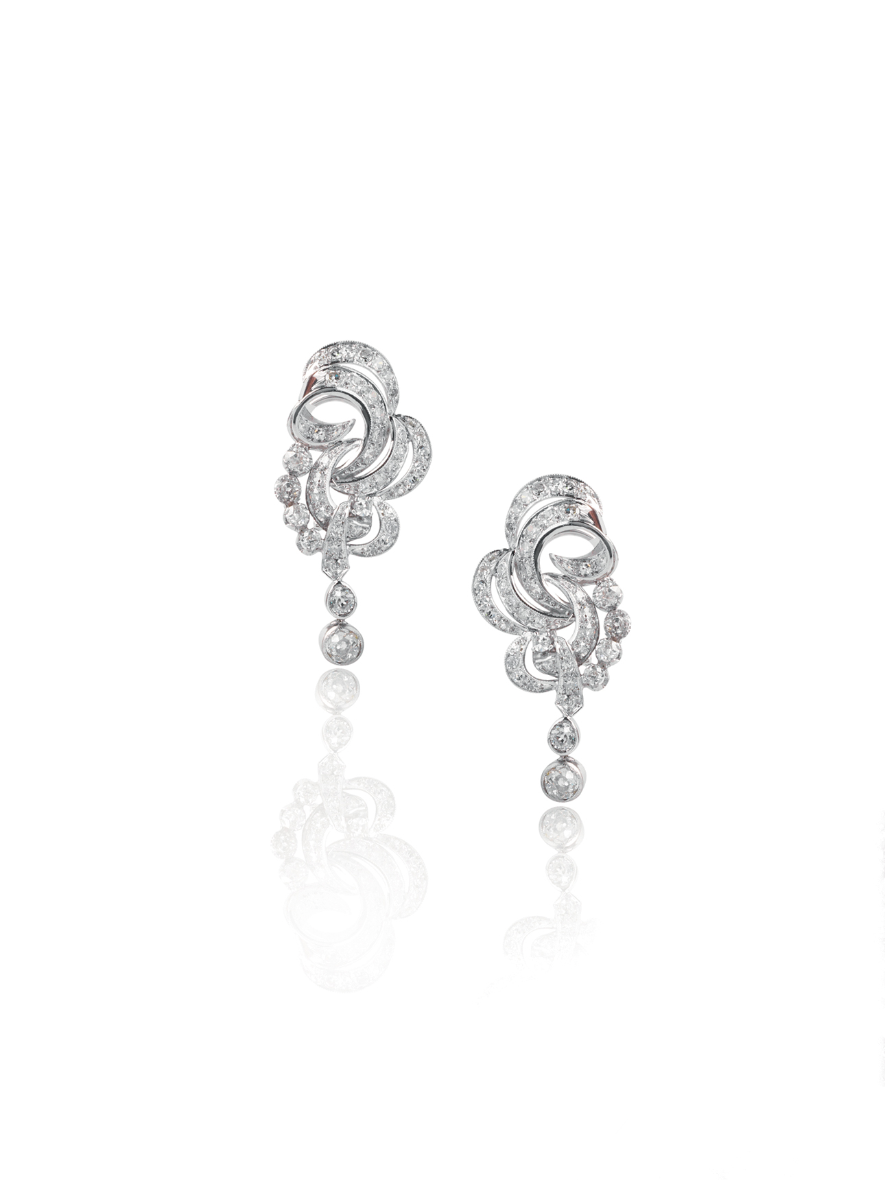 PAIO DI ORECCHINI PENDENTI IN ORO BIANCO E DIAMANTI montatura in oro bianco 14 kt a volute traforate decorate in diamanti taglio vecchio e huit-huit per ct 1.50 circa, lungh. cm 4 PAIR OF PENDANT EARRINGS IN DIAMONDS AND 14K WHITE GOLD
