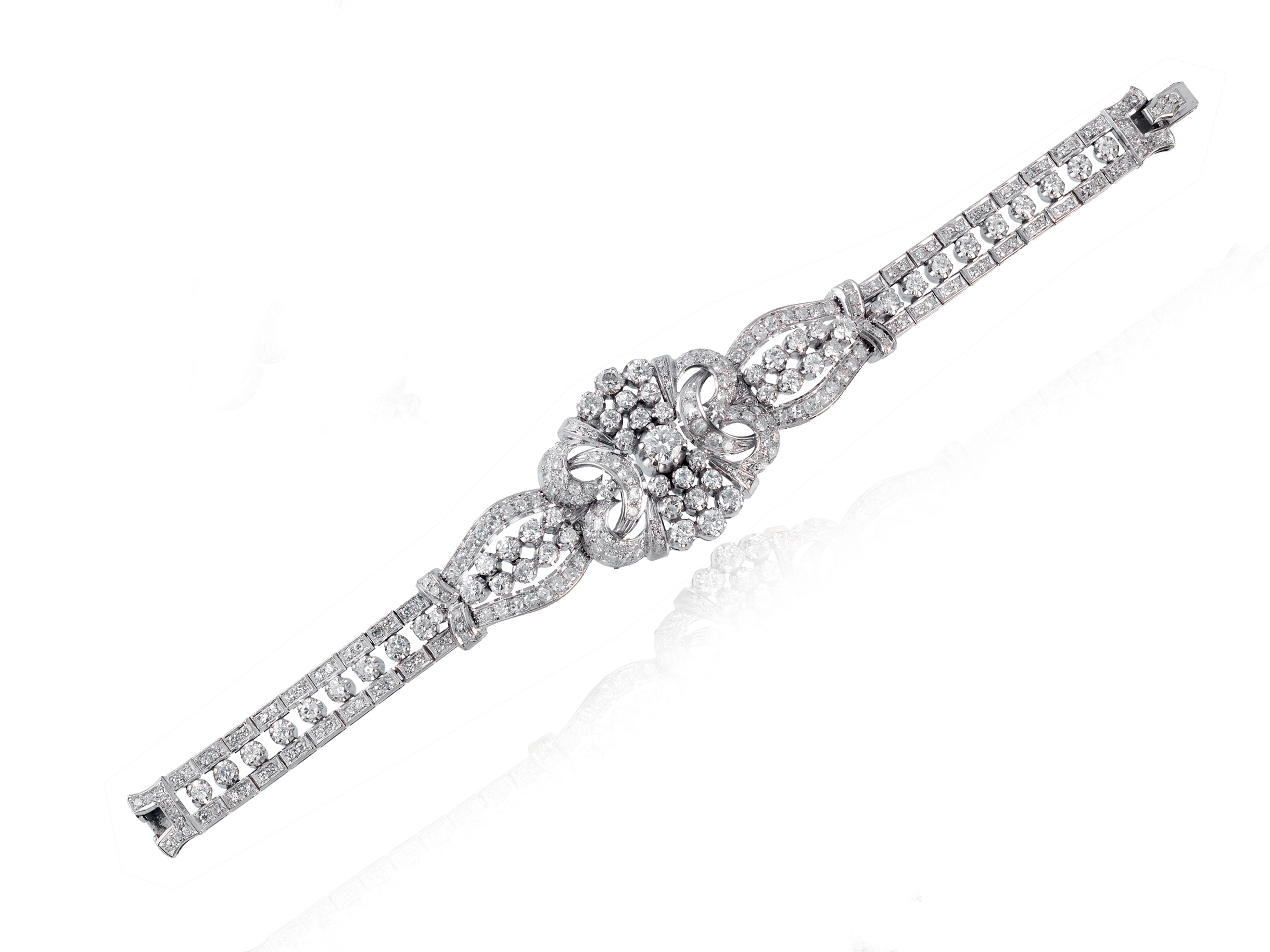 BRACCIALE IN ORO BIANCO E DIAMANTI, ANNI ‘60 a tre linee di castoni ed elementi a barretta con al centro un motivo a volute, decorato in diamanti taglio brillante rotondo e huit-huit per ct 6,60 circa, punzone 750, lungh. cm 18 DIAMONDS AND WHITE GOLD BRACELET, CIRCA 1960