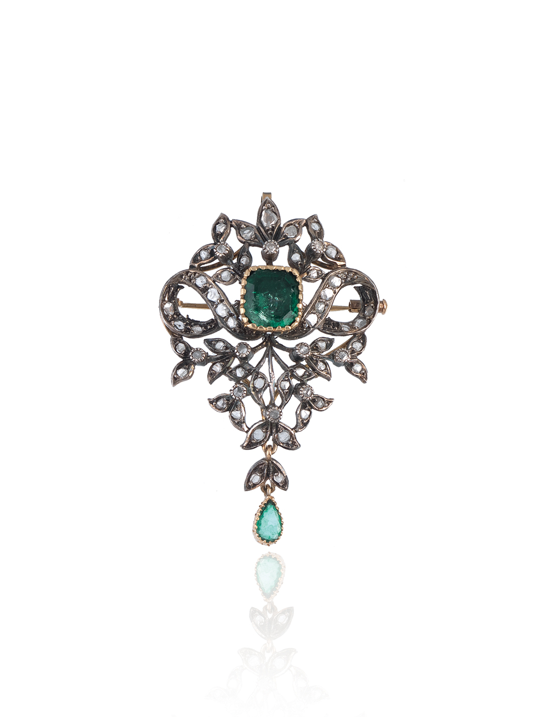 PENDENTE/SPILLA IN ORO GIALLO, ARGENTO, DIAMANTI E SMERALDI, FINE SEC. XIX...