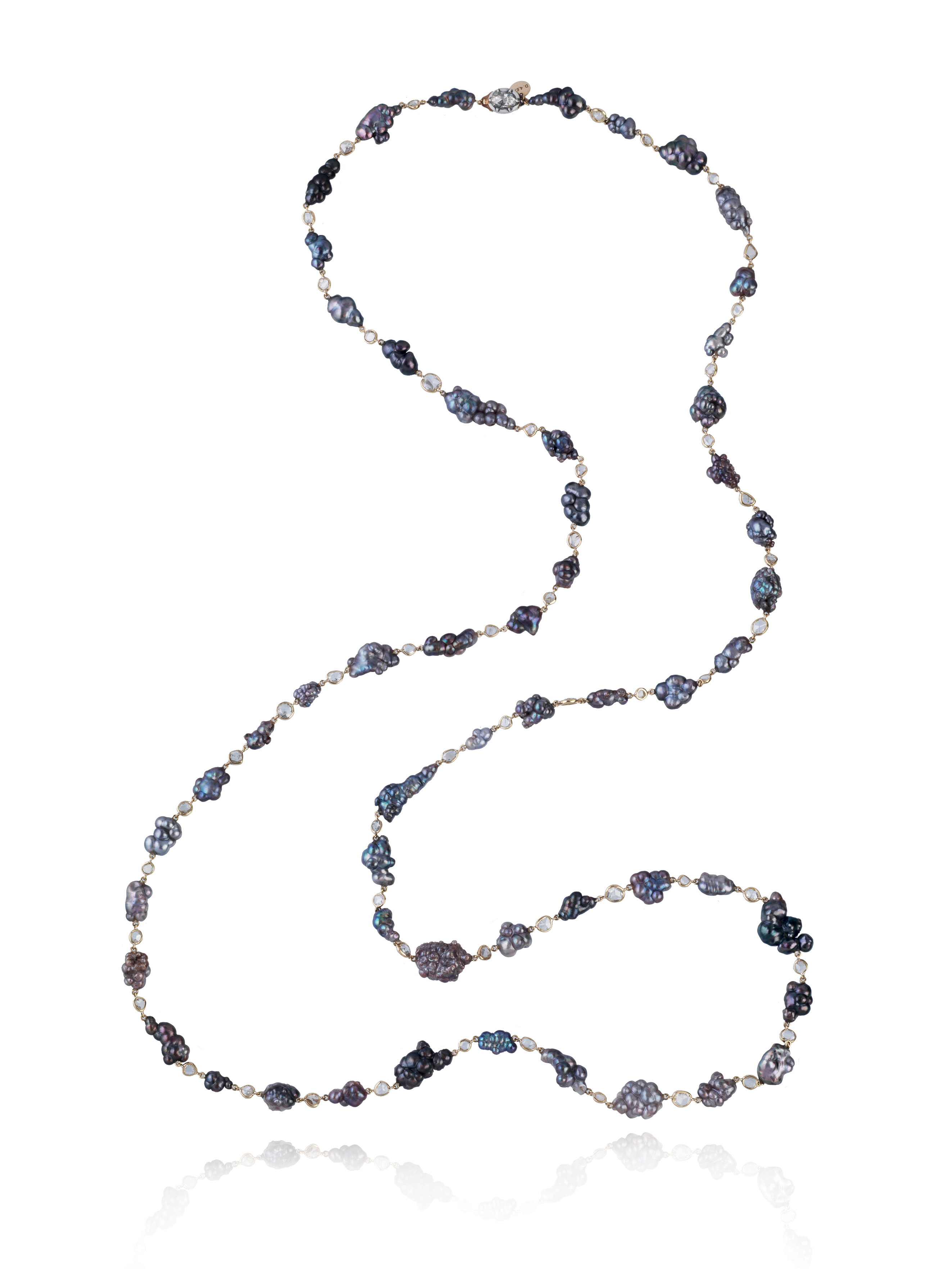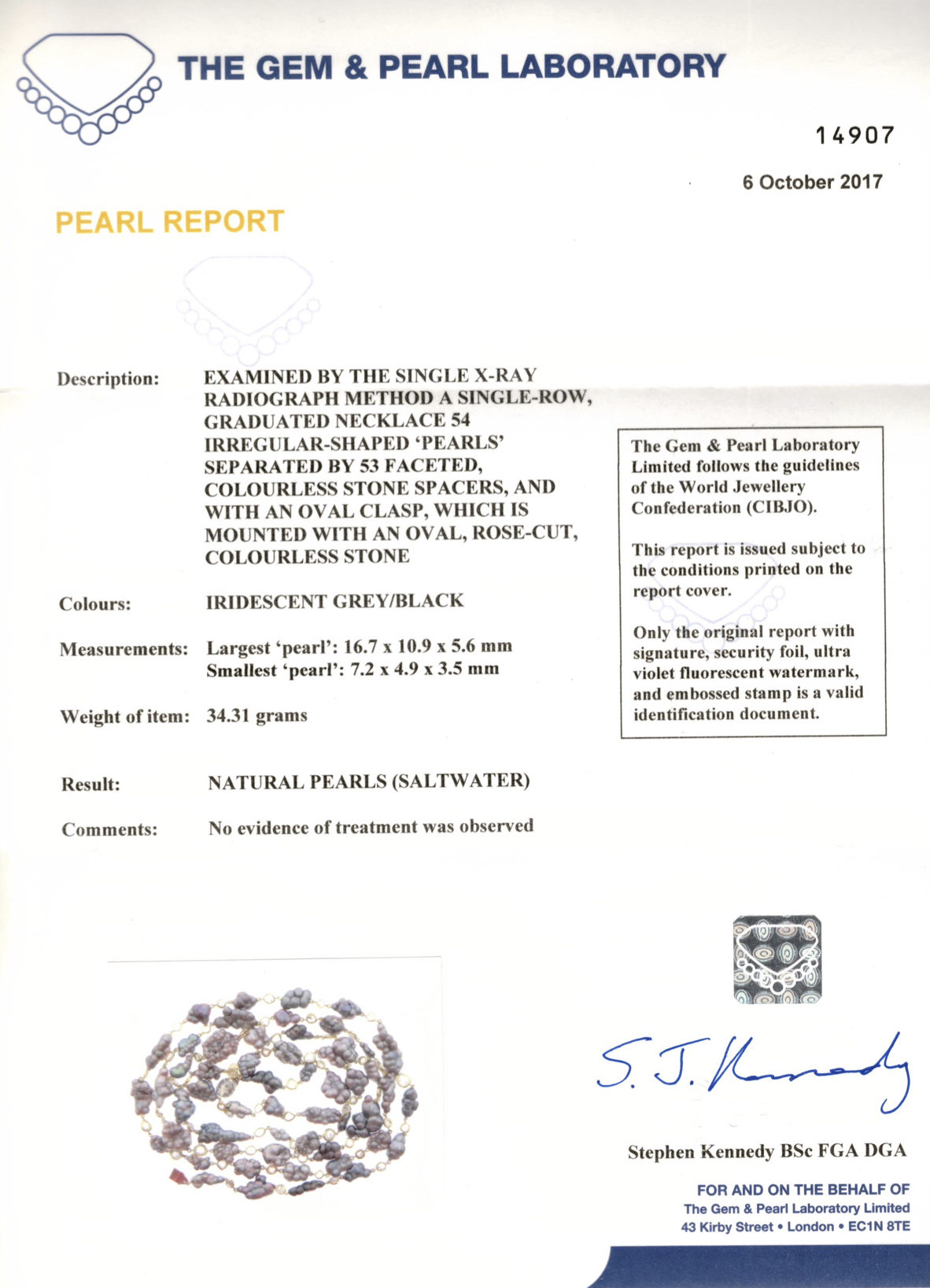 LUNGA COLLANA IN ORO GIALLO, DIAMANTI E PERLE NATURALI ad una linea di cinquantaquattro perle naturali grigie-nere da mm 7,2x4,9x3,5 a mm 16,7x10,9x5,6 intercalate da diamanti taglio rosa per ct 4,60 circa, chiusura ovale decorata da rosa di diamante, punzone 750, lungh. cm 100 corredata di certificato TG&PL n. 14907 datato 10/2017 che attesta l’origine naturale d’acqua salata delle perle NATURAL PEARLS, DIAMONDS AND YELLOW GOLD LONG NECKLACE