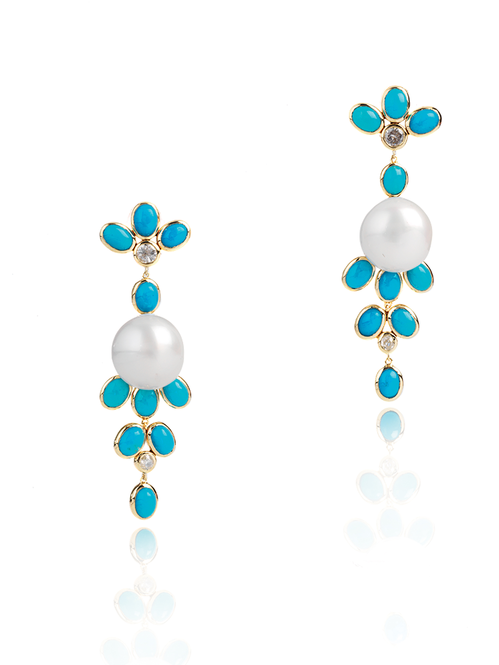 PAIO DI ORECCHINI PENDENTI, CHRISTOSM, IN ORO GIALLO, TURCHESE, PERLE E DIAMANTI elemento trilobato e parte pendente decorati in turchesi cabochon ovali impreziositi da diamanti, al centro due perle a bottone diam. mm 16-16,2, punzoni ChristosM e 750, lungh. cm 6,5, corredati di scatola PAIR OF PENDANT EARRINGS, CRISTOSM, IN TURQUOISE, PEARLS, DIAMONDS AND YELLOW GOLD