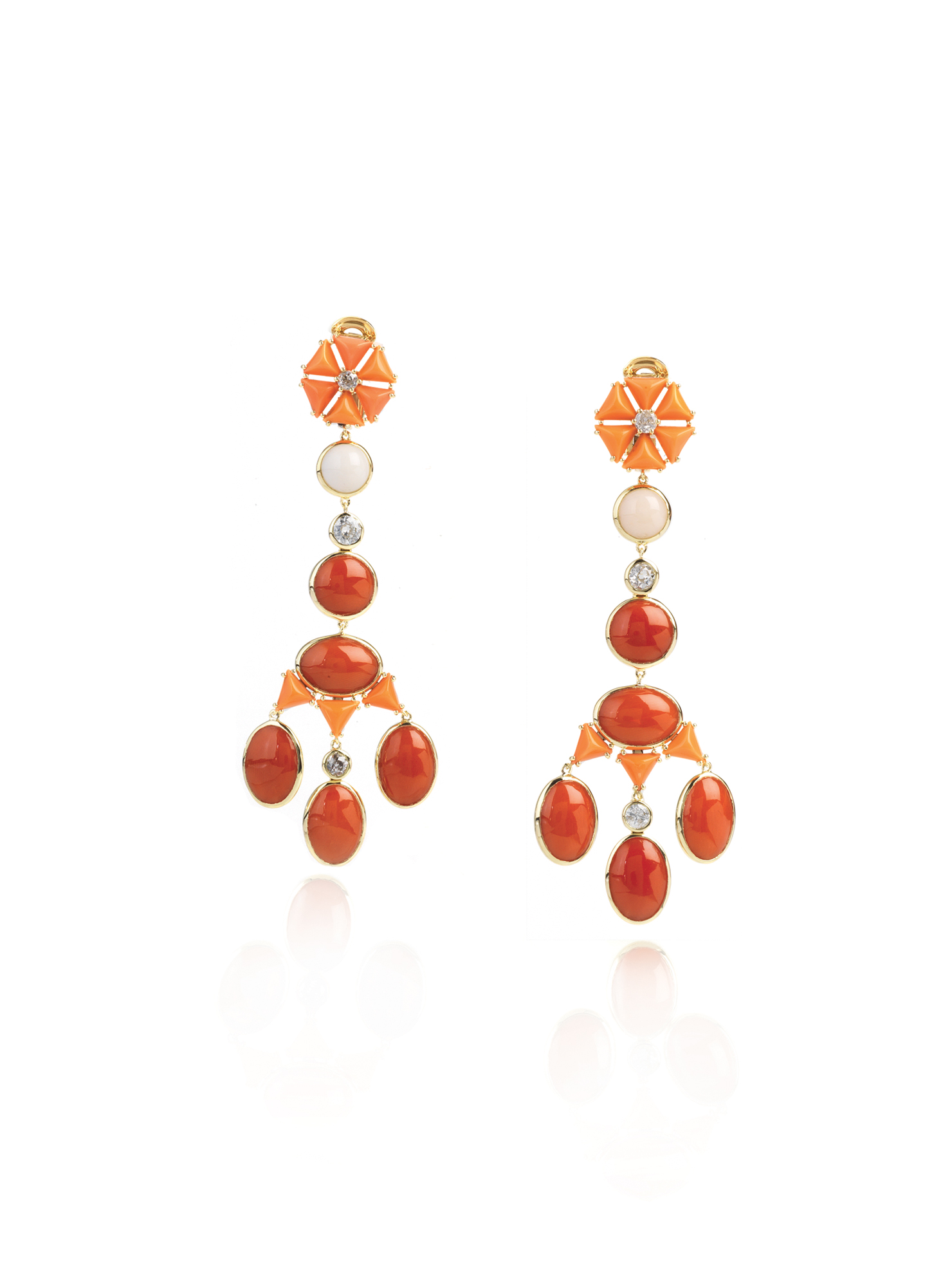 PAIO DI ORECCHINI PENDENTI, CHRISTOSM, IN ORO GIALLO, CORALLO E DIAMANTI elemento a fiore e pendente decorati in corallo rosso e rosa taglio cabochon rotondo, corallo salmone taglio cabochon triangolare e diamanti a formare una composizione con tre pendenti finali, punzoni ChristosM e 750, lungh. cm 8, corredati di scatola PAIR OF PENDANT EARRINGS, CRISTOSM, IN CORAL, DIAMONDS AND YELLOW GOLD