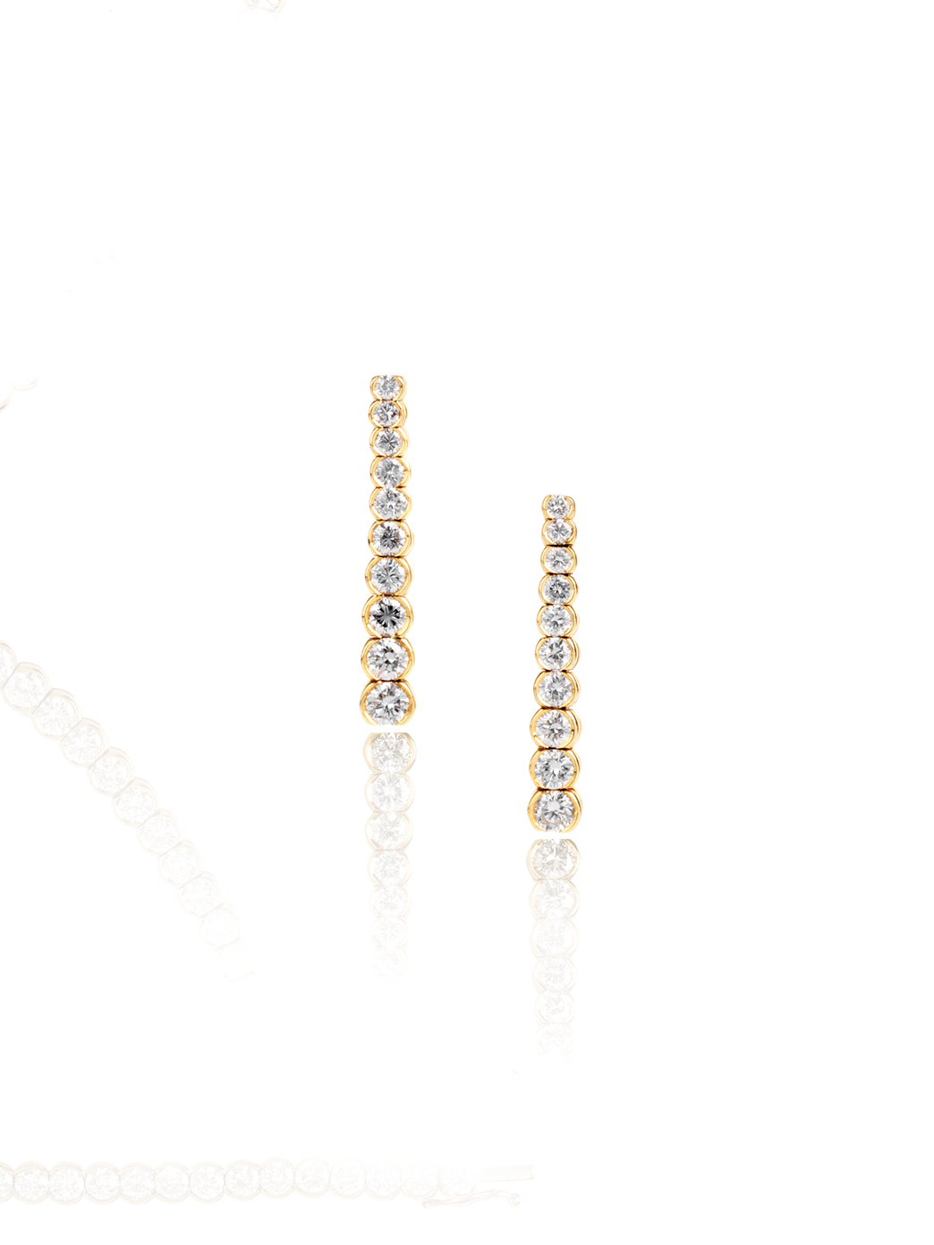 PAIO DI ORECCHINI PENDENTI IN ORO GIALLO E DIAMANTI ad una linea di dieci diamanti taglio brillante rotondo per ct 2.90 circa entro montatura flessibile, punzone 750, lungh. cm 3,2 PAIR OF PENDANT EARRINGS IN DIAMONDS AND YELLOW GOLD