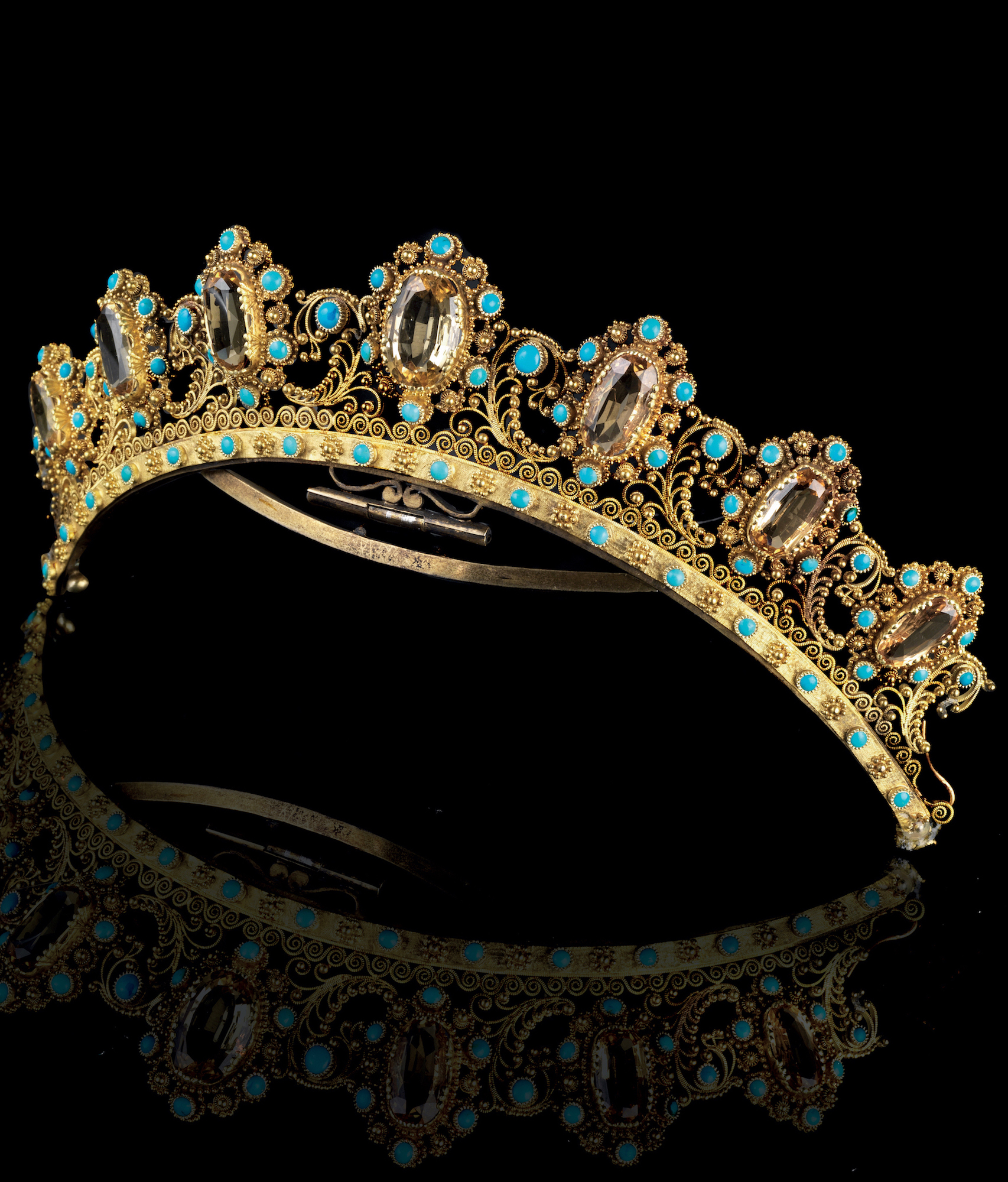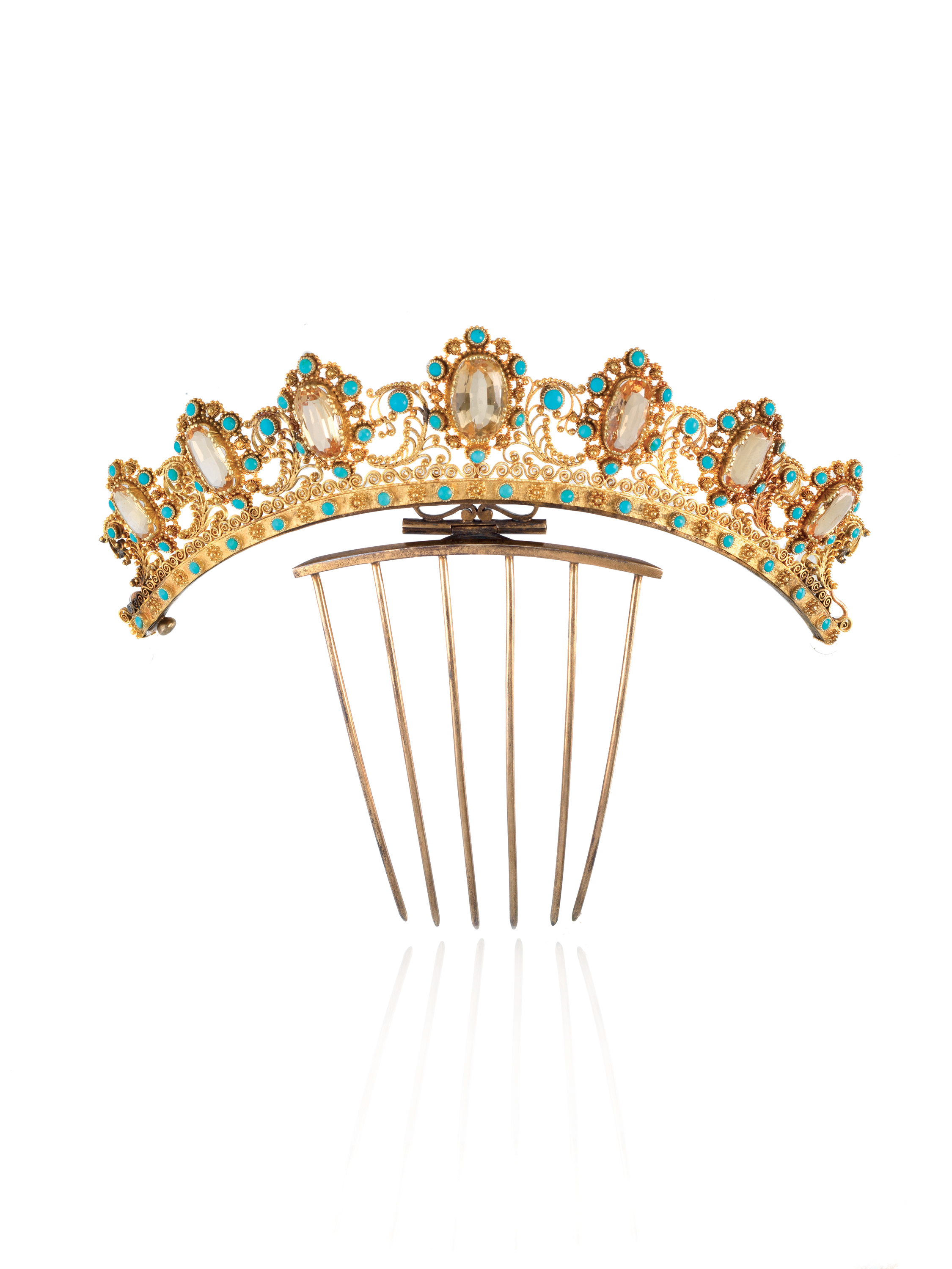 TIARA CON PETTINE IN ORO GIALLO, ARGENTO, QUARZI CITRINI E TURCHESI, FINE SEC. XIX realizzata con sette grandi quarzi citrini taglio ovale posti in gradazione entro castoni perlinati impreziositi da turchesi cabochon e collegati tra loro da volute vegetali stilizzate; pettine amovibile in argento dorato dim. cm 13x15x3,5 TIARA WITH COMB IN CITRINE QUARTZ, TURQUOISES, YELLOW GOLD AND SILVER, LATE 19TH CENTURY