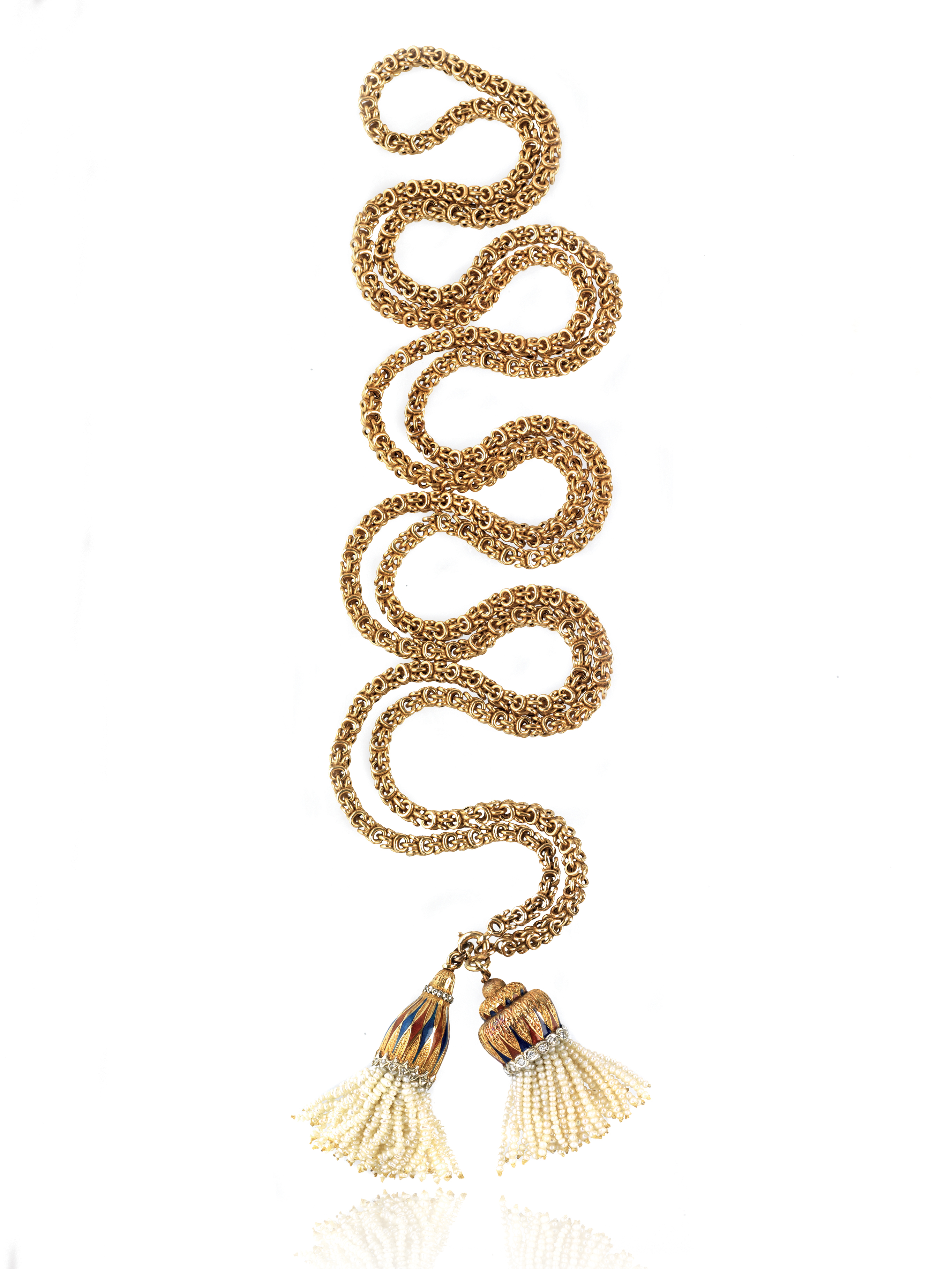 LUNGA CATENA CON PENDENTI IN ORO GIALLO, SMALTI POLICROMI, MICROPERLE E DIAMANTI ad una fila di catena a maglie intrecciate a sezione quadrata, due pendenti in oro cesellato decorato in smalti e brillanti con finale a nappa in microperle, lungh. cm 125 LONG CHAIN WITH PENDANTS IN YELLOW GOLD, ENAMEL, MICROPEARLS AND DIAMONDS