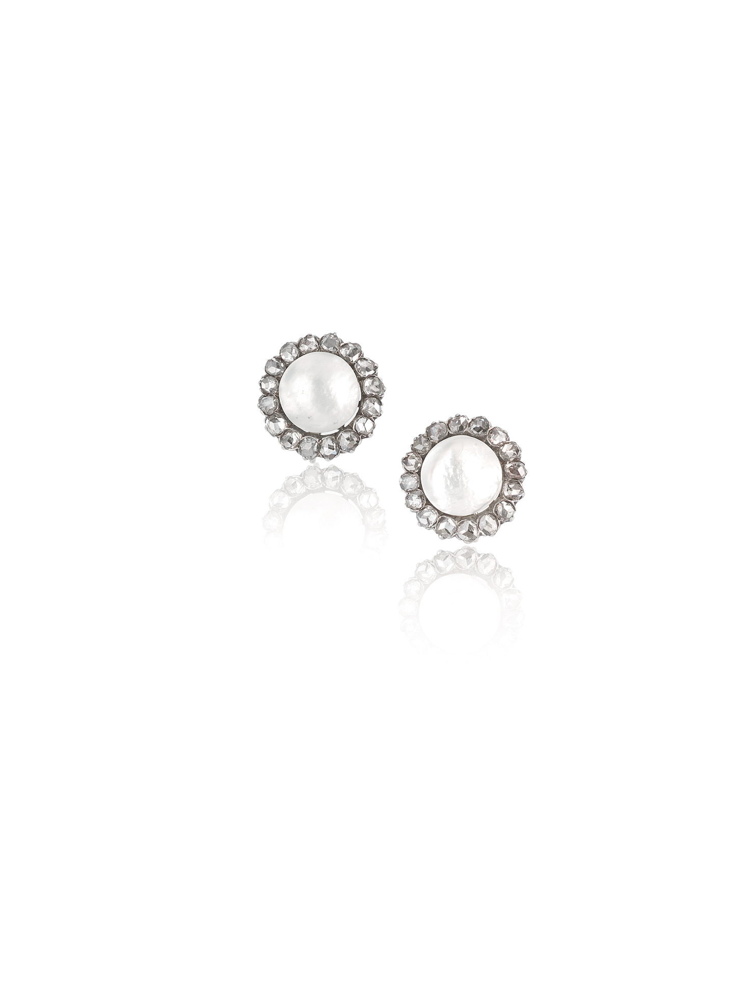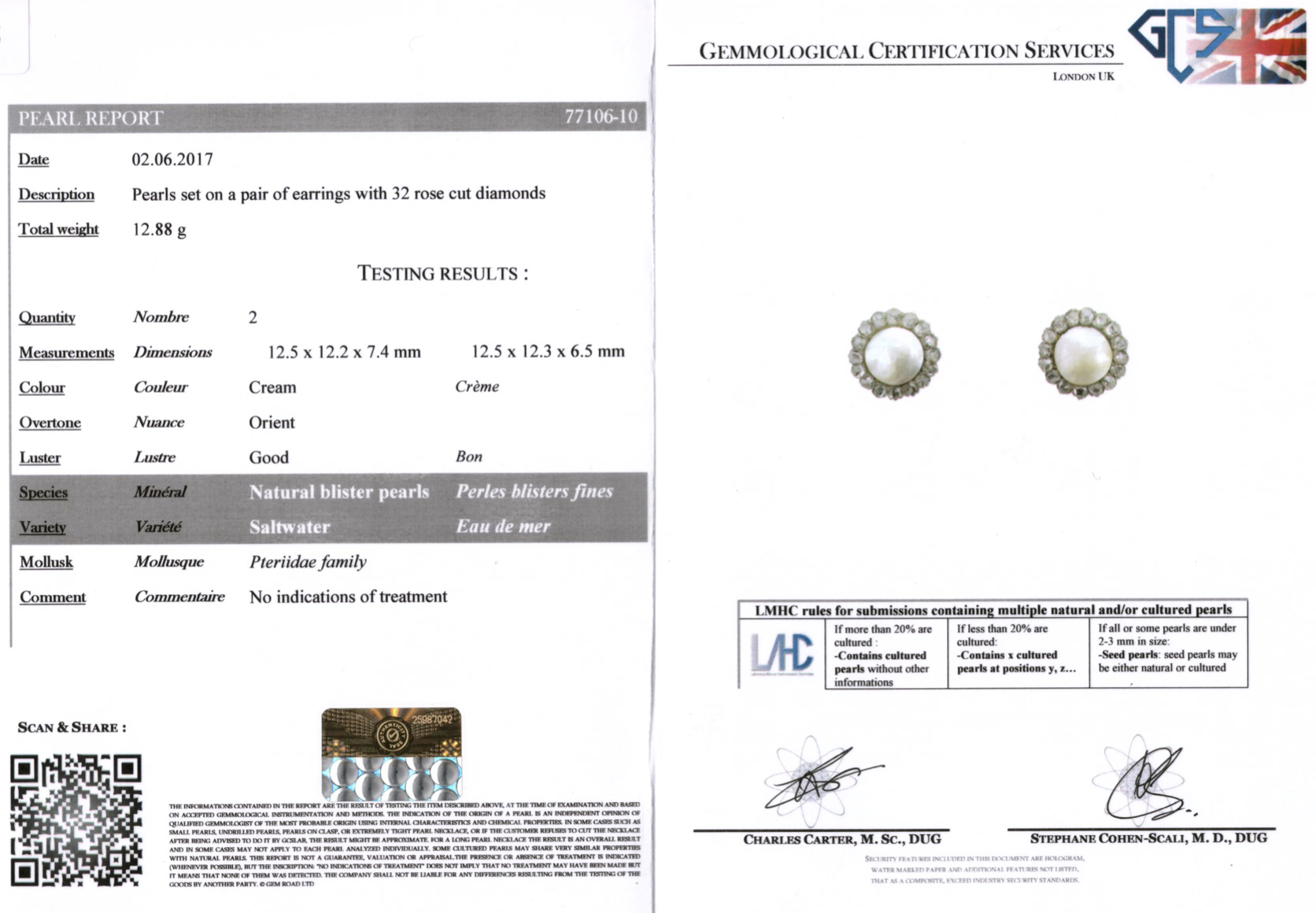 PAIO DI ORECCHINI IN ORO GIALLO, ARGENTO, PERLE NATURALI E DIAMANTI, INIZI SEC. XX due perle a bottone di mm 12,5x12,2x7,4 e mm 12,5x12,3x6,5 entro corolla in argento e diamanti, diam. cm 2 corredato di certificato GCS n. 77106-10 datato 06/2017 che attesta l’origine naturale d’acqua salata delle perle PAIR OF EARRINGS IN NATURAL PEARLS, DIAMONDS, YELLOW GOLD AND SILVER, EARLY 20TH CENTURY