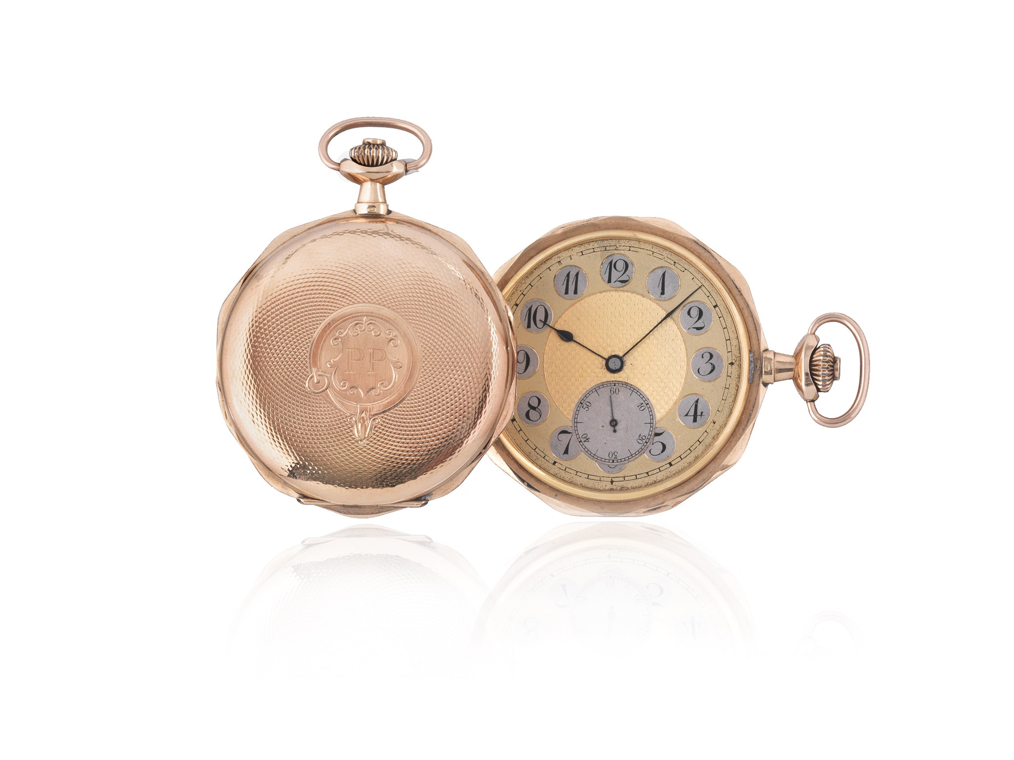 ANONIMO SVIZZERO, N. 84145, FINE SEC. XIX OROLOGIO DA TASCA IN ORO 14 K A SAVONETTE, FINE SEC. XIX CASSA: dal profilo ottagonale a savonette in oro guillochè con scudo centrale e monogramma incisi, punzone svizzero dell’oro 14 K QUADRANTE: dorato, con riserva centrale guillochè, ore in numeri arabi entro riserve circolari argento, quadrante ausiliario per i secondi a ore sei, lancette piriformi MOVIMENTO: scappamento ad àncora DIAMETRO: mm 53 A KEY-LESS 14 K GOLD SWISS POCKET WATCH, N. 84145, LATE 19th CENTURY DIM: 53 mm