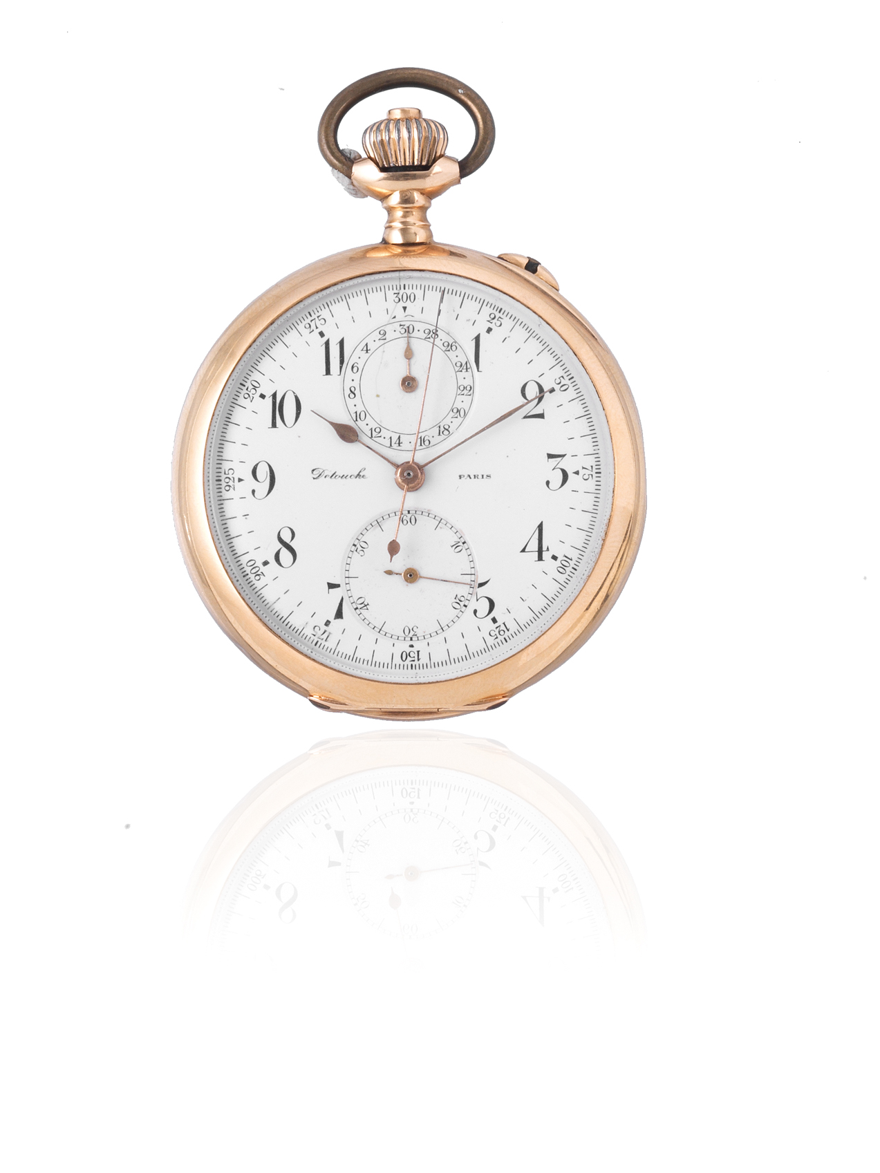 DETOUCHE, PARIS, CASSA N. 71424, 1860 CIRCA OROLOGIO DA TASCA IN ORO 18 K CON CRONOGRAFO CASSA: a quattro corpi in oro rosa, corona di carica con pulsante cronografico a ore 12, pulsante per la rimessa dell’ora a ore 1, numerata 71424 QUADRANTE: in smalto bianco con numeri arabi, due quadranti ausiliari a ore 6 e 12 rispettivamente per i secondi ed il registro dei 30 minuti, scala periferica a 300 unità, lancette piriformi, firmato Detouche Paris MOVIMENTO: scappamento ad àncora, numerato 27837 DETOUCHE, PARIS, CASSA N. 71424, CIRCA 1860 A 18 K OPEN-FACE POCKET CHRONOMETER Case numbered 71424, dial signed Detouche Paris, movement numbered 27837 DIAM: 50 mm