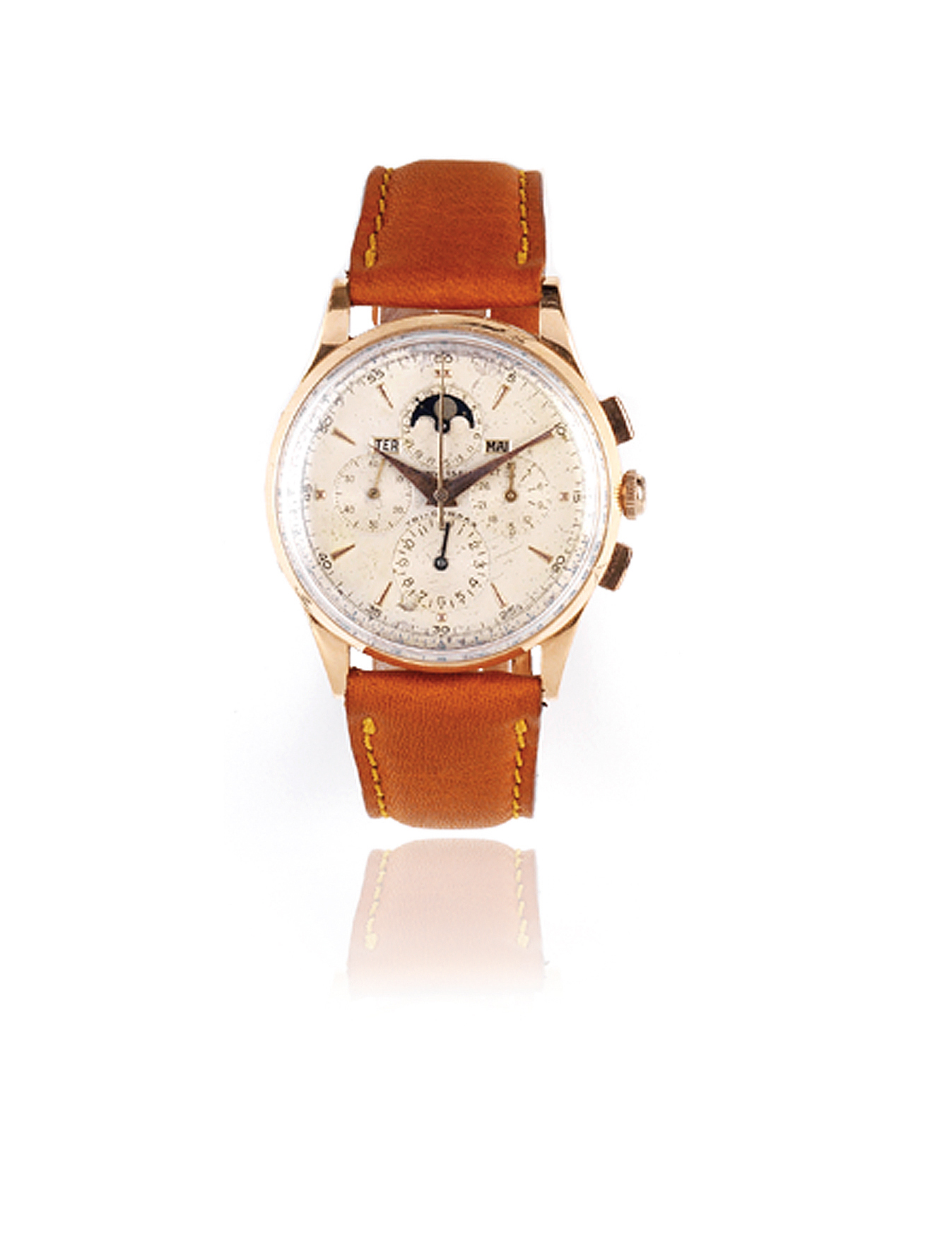 UNIVERSAL GÉNEVE, TRI-COMPAX, REF. 12296, CASSA N. 1454673, PRODOTTO NEL 1949-50 OROLOGIO DA POLSO IN ORO ROSA 18 K CON CRONOGRAFO, TRIPLO CALENDARIO, FASI LUNARI E SCALA TACHIMETRICA, FIBBIA UNIVERSAL GÉNEVE IN METALLO DORATO, CORREDATO DI SCATOLA ORIGINALE E MOVIMENTO AGGIUNTIVO CALIBRO 481 MANCANTE DELLE PARTI CRONOGRAFICHE CASSA: in tre corpi in oro lucido e satinato, fondello a scatto, pulsanti cronografici rettangolari, vetro plastica QUADRANTE: argentè, indici applicati a punta di freccia, quattro quadranti ausiliari con secondi continui, contatori dei minuti e delle ore, giorno del mese e fasi lunari, due finestrelle per il giorno della settimana e il mese, lancette Dauphine, secondi cronografici al centro, scala tachimetrica periferica in blu MOVIMENTO: meccanico a carica manuale, calibro 481 Cassa, quadrante e movimento firmati DIAMETRO: mm 38 UNIVERSAL GÉNEVE TRI-COMPAX REF. 12296, CASSA N. 1454673, CIRCA 1949-’50 A VERY FINE 18 PINK GOLD TRIPLE CALENDAR CHRONOGRAPH WRISTWATCH WITH REGISTERS AND MOON PHASES, Accompanied by the original box AND ADDITIONAL MOVEMENT CAL 481 Dial, case and movement signed DIAM.: mm 38
