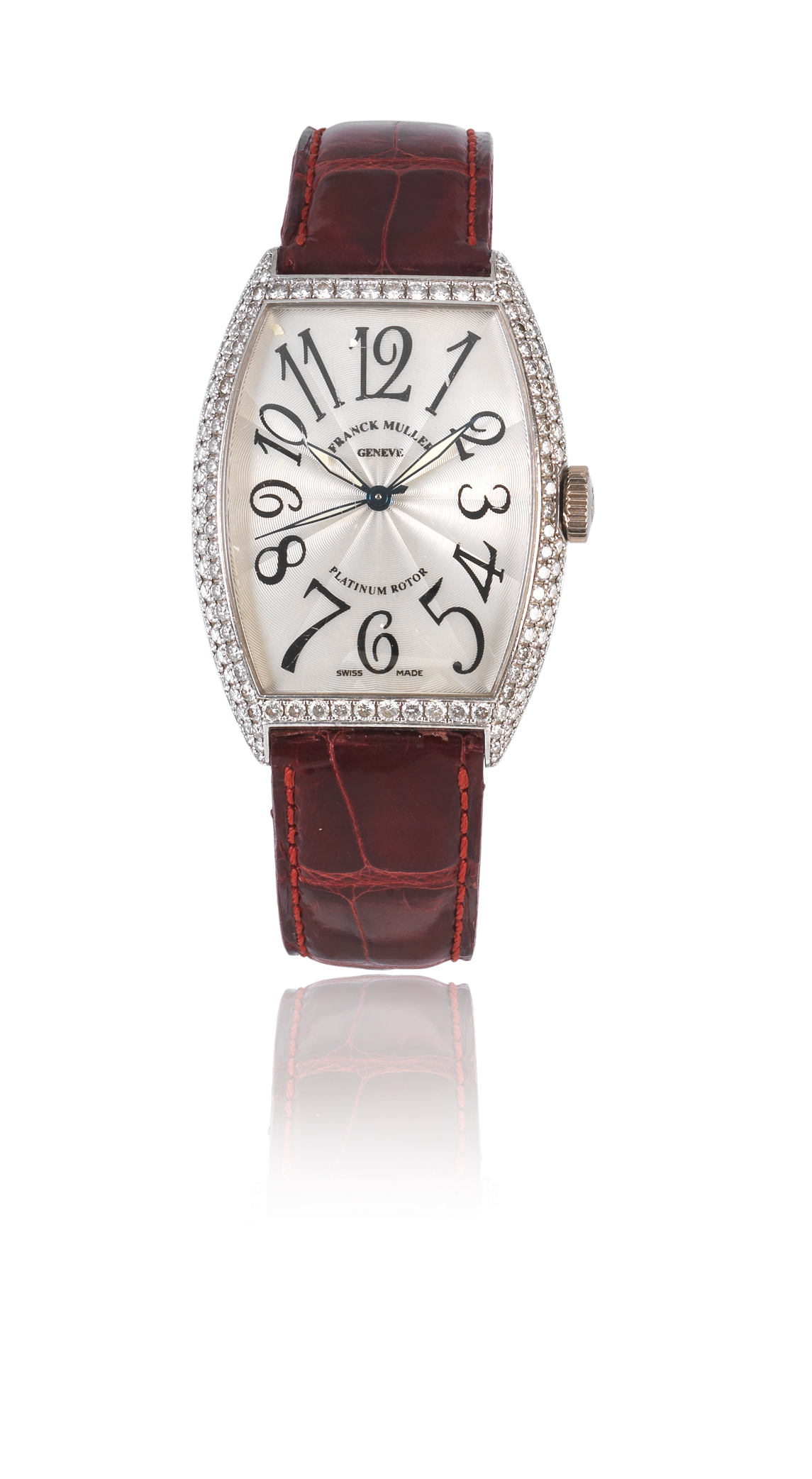 FRANCK MULLER CASABLANCA, REF. 6850 SC D, N. 32, PRODOTTO NEL 2000 CIRCA OROLOGIO DA POLSO, IN ORO BIANCO E DIAMANTI, IMPERMEABILE, AUTOMATICO, CON GRANDE CASSA TONNEAU INCURVATA, SECONDI CENTRALI, FIBBIA IN ORO E DIAMANTI FRANCK MULLER CASSA: tonneau incurvata in due corpi, in oro lucido e satinato decorata in pavè di diamanti taglio brillante rotondo, fondello chiuso da quattro viti, vetro zaffiro bombato QUADRANTE: argenté guilloché con grandi numeri arabi radiali, secondi al centro, lancette con inserto in materiale luminescente MOVIMENTO: meccanico a carica automatica, calibro 2800 F. M. con rotore in platino 950 Cassa, quadrante e movimento firmati DIM: mm 34x47 FRANCK MULLER CASABLANCA, REF. 6850SC D, N. 32, CIRCA 2000 A LARGE 18 K WHITE GOLD AND DIAMOND, TONNEAU SHAPED AND CURVED, AUTOMATIC, CENTRE SECONDS, WATER- RESISTANT WRISTWATCH WITH A WHITE GOLD AND DIAMONDS BUCKLE Dial, case and movement signed DIM: 34x47 mm