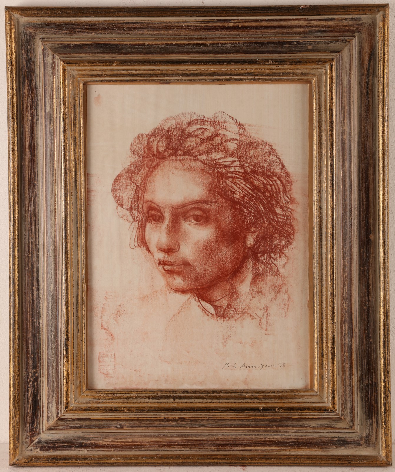 ANNIGONI PIETRO (1910 - 1988) Volto di donna - ragazzo?. Sanguigna su carta . Cm 28,00 x 38,00. Firma in basso a destra. Opera archiviata presso l'Archivio fotografico ed expertise dell'opera di Pietro Annigoni - Gilberto Grilli, Fano come da documentazione fotografica allegata all'opera riportante il relativo numero d'inventario.