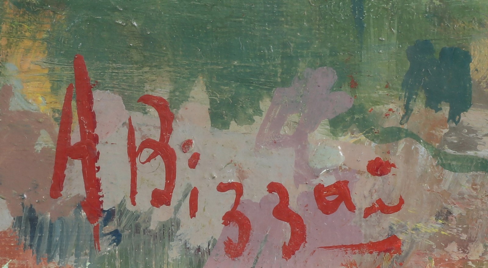 BIZZAI ALBERTO (1926 - 2004) Verso il lago d'Iseo. Olio su tela . Cm 50,00 x 30,00. Firma in basso a destra. Titolo al retro. Cornice presente