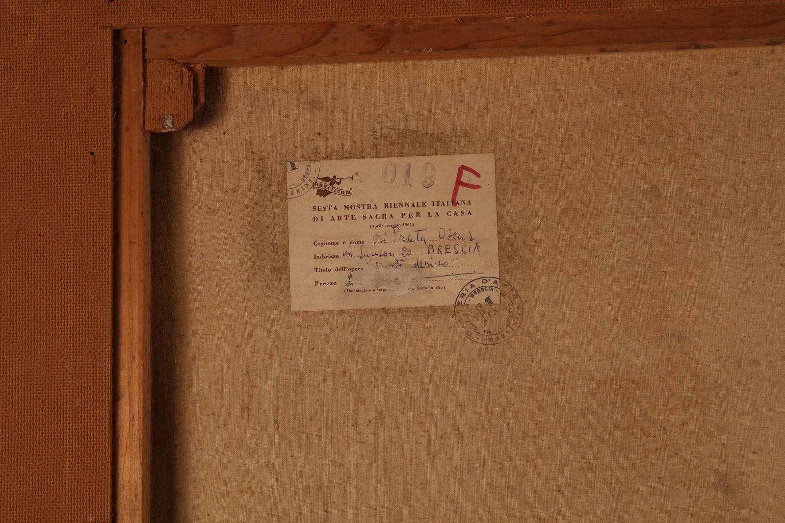 DI PRATA OSCAR (1910 - 2006) Senza titolo. Olio su tela . Cm 100,00 x 80,00. Firma in basso a sinistra. Al retro timbro Galleria d'arte Mazzini e cartiglio espositivo della VI mostra Biennale Italiana di arte Sacra per la casa ( Aprile - Maggio 1963). Cornice presente